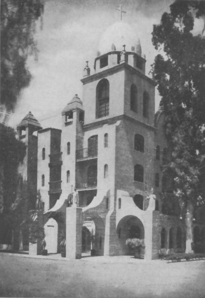 This inn is an honest and just tribute to the influence of the Old Mission Fathers of California, as necessary to a complete understanding of the far-reaching power of their work as is El Camino Real, the Mission Play, or the Mission Style of architecture. After listening to lectures on the work of the Franciscan padres and visiting the Missions themselves, its owners, Mr. and Mrs. Frank Miller, humanely interested in the welfare of the Mission Indians, collectors of the handicrafts of these artistic aborigines, and students of what history tells us of them, began, some twenty-five years ago, to realize that in the Mission idea was an ideal for a modern hotel. Slowly the suggestion grew, and as they discussed it with those whose knowledge enabled them to appreciate it, the clearer was it formulated, until some ten or a dozen years ago time seemed ripe for its realization. Arthur B. Benton, one of the leading architects of Southern California, formulated plans, and the hotel was erected. Its architecture conforms remarkably to that of the Missions. On Seventh Street are the arched corridors of San Fernando, San Juan Capistrano, San Miguel and San Antonio de Padua; inside is an extensive patio and the automobiles stop close to the Campanile reproducing the curved pediments of San Gabriel. On the Sixth Street side is the fachada of Santa Barbara Mission, and over the corner of Sixth and Orange Streets is the imposing dome of San Carlos Borromeo in the Carmelo Valley, flanked by buttresses of solid concrete, copies of those of San Gabriel.