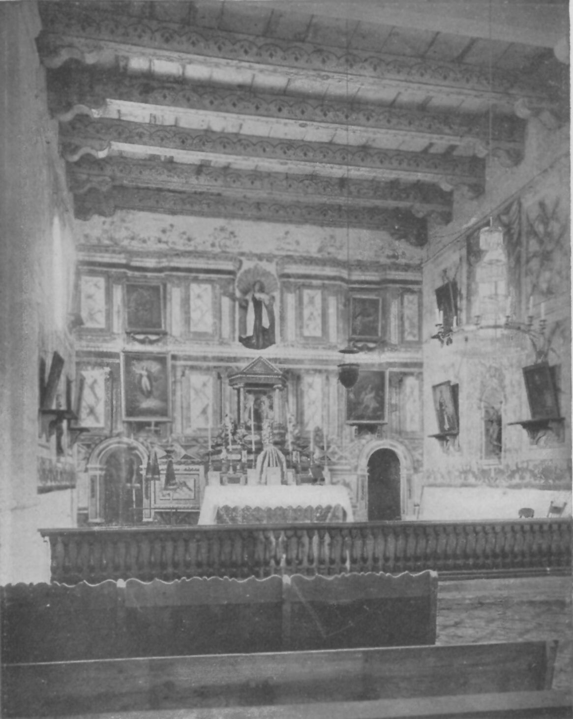 We cannot to-day determine how the Franciscans of the Southwest decorated the interiors of all their churches. Some of these buildings have disappeared entirely, while others have been restored or renovated beyond all semblance of their original condition. But enough are left to give us a satisfactory idea of the labors of the fathers and of their subject Indians. At the outset, it must be confessed that while the fathers understood well the principles of architecture and created a natural, spontaneous style, meeting all obstacles of time and place which presented themselves, they showed little skill in matters of interior decoration, possessing neither originality in design, the taste which would have enabled them to become good copyists, nor yet the slightest appreciation of color-harmony. In making this criticism, I do not overlook the difficulties in the way of the missionaries, or the insufficiency of materials at command. The priests were as much hampered in this work as they were in that of building. But, in the one case, they met with brilliant success; in the other they failed. The decorations have, therefore, a distinctly pathetic quality. They show a most earnest endeavor to beautify what to those who wrought them was the very house of God. Here mystically dwelt the very body, blood, and reality of the Object of Worship. Hence the desire to glorify the dwelling-place of their God, and their own temple. The great distance in this case between desire and performance is what makes the result pathetic. Instead of trusting to themselves, or reverting to first principles, as they did in architecture, the missionaries endeavored to reproduce from memory the ornaments with which they had been familiar in their early days in Spain. They remembered decorations in Catalonia, Cantabria, Mallorca, Burgos, Valencia, and sought to imitate them; having neither exactitude nor artistic qualities to fit them for their task. No amount of kindliness can soften this decision. The results are to be regretted; for I am satisfied that, had the fathers trusted to themselves, or sought for simple nature-inspirations, they would have given us decorations as admirable as their architecture. What I am anxious to emphasize in this criticism is the principle involved. Instead of originating or relying upon nature, they copied without intelligence. The rude brick, adobe, or rubble work, left in the rough, or plastered and whitewashed, would have been preferable to their unmeaning patches of color. In the one, there would have been rugged strength to admire; in the other there exists only pretense to condemn.