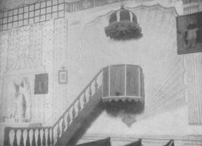 On the walls, the wainscot line is set off with the sinuous body of the serpent, which not only lends itself well to such a purpose of ornamentation, but was a symbolic reminder to the Indians of that old serpent, the devil, the father of lies and evil, who beguiled our first parents in the Garden of Eden.