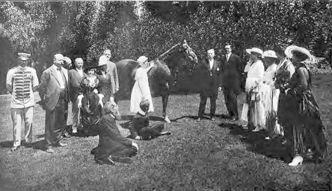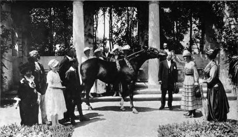 Early in the year 1915 I was called to lecture on California and the West in the beautiful Sunset Theater of the Southern Pacific Building at the San Francisco Exposition. In taking a survey of the Zone I was soon attracted to a gigantic horse in process of manufacture out of wood and plaster, and a placard before it indicated that a trained horse would soon be shown here. Being fond of animals, naturally, and having seen and read considerably of trained horses, I was ready for the first opening of this show, and there was introduced to CAPTAIN, the educated horse, or, as he has been termed, “the horse with the human brain.” My opinions as to the quality of Captain’s intelligence I have recorded later, but his first performance was a delight to me. His appearance was pleasing. He looked well cared for, contented, happy and willing to go through his exhibition. There was none of the holding back, the whipping, the sharp orders, the ugly looks one so generally sees on the faces of “trained animals” when they are being put through their tricks. Most of these poor creatures show so manifestly that they are trapped, are made to do what they do not like, and that they resent it, that I seldom can tolerate the sight of their anger and humiliation—for that is clearly what nearly every animal reveals to me at these exhibitions. Here, on the other hand, was an animal that enjoyed his work. He treated it as fun; just as my own Arab colt treats a free run and then being led into his corral and being petted. After a little pleasantry his master asked him to count the number of ladies on the front row. Captain’s eyes at once began at one end, followed the row, down to the other end, and, by pawing, he told the number. Several similar questions were asked, as, for instance, how many gentlemen in the second row; how many women along the aisle; how many girls, or boys, in the second or third rows, etc., and in every case Captain gave the answer correctly.