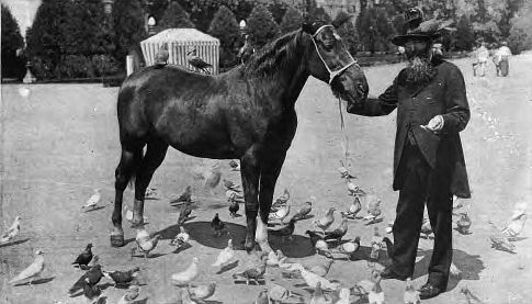 Soon after we arrived in San Diego a lady presented Jasper with a pigeon. The bird was taken to the stable, and Captain became much interested in her. As the pigeon perched on the partition he reached up and nuzzled it in the most affectionate manner. Not only did the pigeon not resent it, but she seemed actually to enjoy it, showing no fear or desire to get away. Now they are almost inseparable friends, and Captain spends hours with his head upon the partition, snuggling close up to the bird. Prior to its coming, Captain often showed considerable nervousness when he heard strange footsteps approaching his stable, or just before a performance, but the presence of the pigeon has changed this. Its mere presence is a soothing influence, and when the show is over he goes back to the stable and greets his bird friend with evident pleasure and affection.