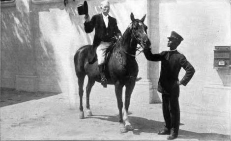 One of my experiences with Captain demonstrated his superior intelligence over most horses. My training barn was two stories high, and a wide pair of stairs led from the ground to the second floor. When my grandson was born Captain took a great liking for him. He loved to “kiss” him and nuzzle him while he was in the cradle, or baby-buggy, or even in his nurse’s arms. As the child grew older we used to place him on Captain’s back and Captain would march back and forth, as proudly as a king, apparently conscious of the trust we placed in him.