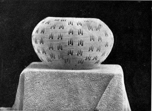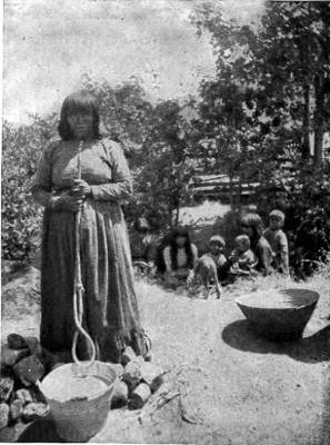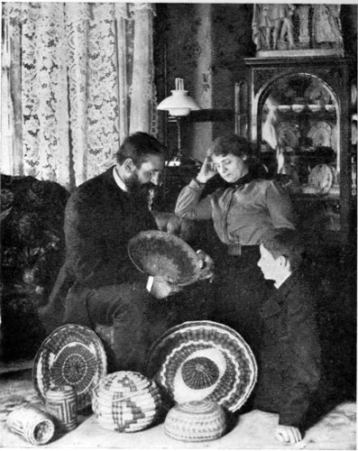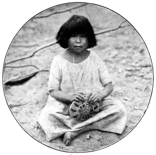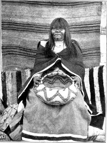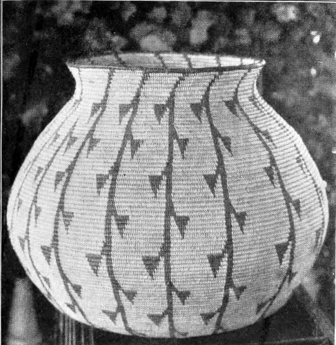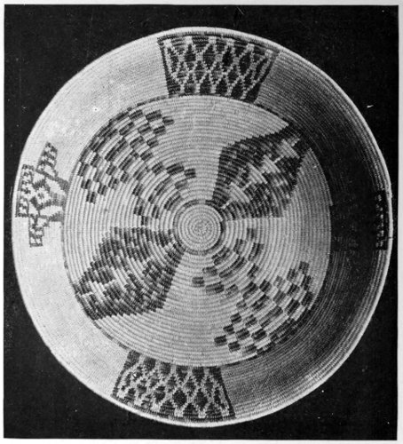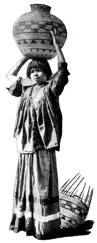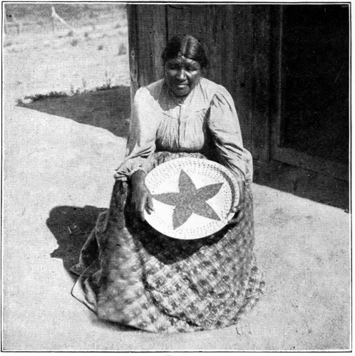 Most certainly I will! The idea that we, the superior, the wise race, use designs in our goods that are supposed to be beautiful to us, and yet that have no meaning! What absurdity and foolishness for our girls and women to spend hours on “fancy-work” (!), the designs of which are a crazy, intricate something to be dreaded rather than admired. The Indians 246 have more sense than to waste their time over such foolishness. They have studied Nature in all her varying forms, and their minds are stored up with a thousand and one designs which they can transfer at pleasure to their basketry, pottery, or blanketry. I have had the pleasure of teaching this basic principle of art work to many white women, and I learned it from the Indian. One woman wanted to get a design for her sofa pillows. I asked her if she had no flowering vine over her porch. She said “Yes.” “Then copy its leaf and flower,” was my reply, and when she did so, and saw the beauty of the design she had created from Nature, her soul was filled with a new joy, and she wrote me that few things had given 247 her more pleasure than the discovery of that basic principle.