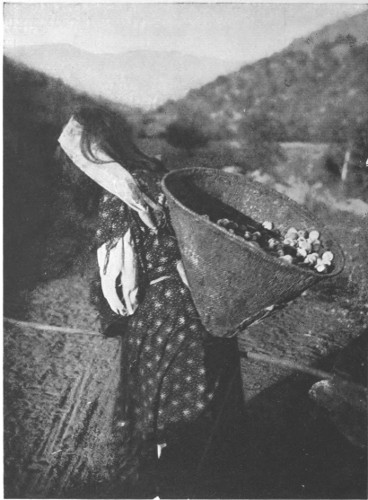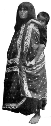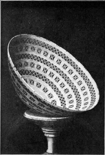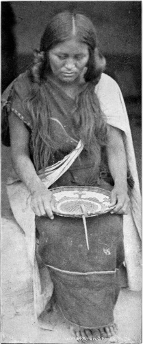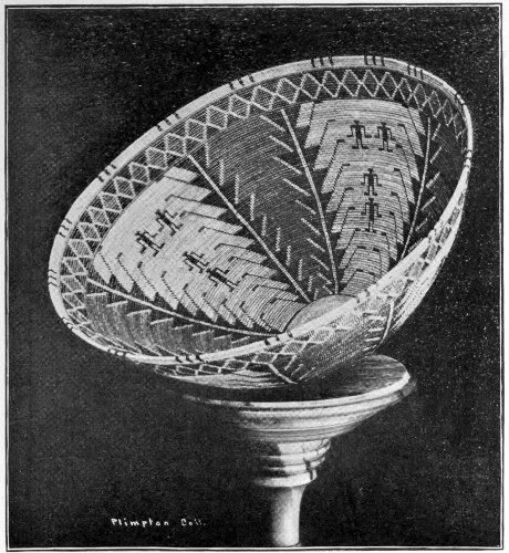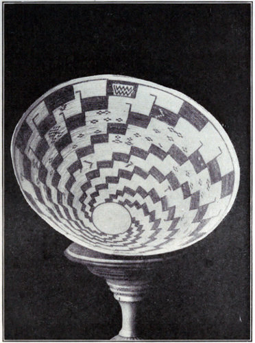 As for weave, it is asserted upon the highest authority that there is not a weave or stitch known to modern art that was not given to our civilization by the aborigines. And they have many stitches of great effectiveness that we have not availed ourselves of. Take the Pomas alone—a tribe of basket-makers who live in northern California. They have not less than fourteen different stitches or weaves, some of them of marvelous beauty and strength. In one of the accompanying pictures is a specimen of their carrying baskets. This basket will hold a large load of seeds or fruit, and when so laden requires a construction of great durability to sustain the burden. It is woven with this express purpose in view, yet it is artistically decorated with a beautifully worked out design. Here is an important lesson the white race might learn, viz., that the utensils of daily life should be surrounded with as much beauty as is practical. The kitchen should be as full of enjoyment to the eye, in reason, as the parlor. The cook and maid need æsthetic surroundings as well as—indeed, more than,—the mistress and her children. If social custom insists upon making servants of one part of its members, the other part should be willing to make their “servitude” as comfortable and beautiful 243 as is possible and practicable. Think of these poor, ignorant(!) Indian women making baskets for porridge, carrying baskets, plaques for holding food, mush bowls, and a score of other purposes, all beautifully decorated and ornamented with designs that express some emotion of their own souls, some ambition, some aspiration, or some happy memory.