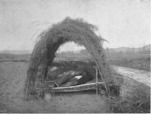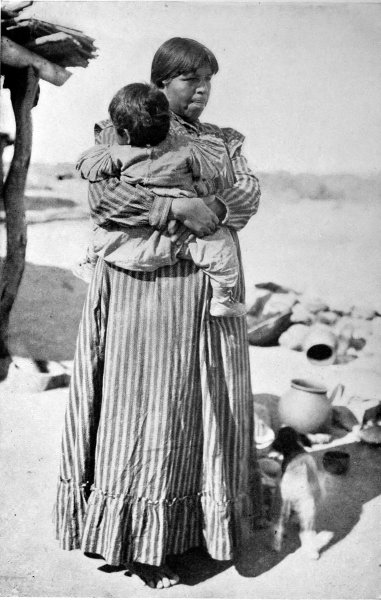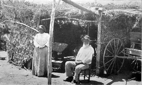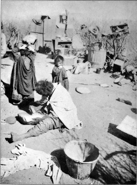 Occasionally I meet with people who would like to visit real Indians in their real homes,—not the dressed-up Indians in a made home, like those of the Midway Plaisance of the World’s Fair or of a “Wild West” show, and they ask me how they can do so. To the ordinary traveler of to-day, who requires all the comforts of a Pullman and a dining car, and who is not willing to forego them for the hardships of a camping-out trip, my advice is don’t, although the hardships are more so in name than in fact. If one likes old clothes, fresh air, the great outdoors, lots of sunshine, desert roads, and meals al fresco,—sleeping at night under the stars,—this is just the country for such things. Given a good team, a careful driver who can cook “frontier style,” and an agreeable traveling companion, and you will have a new thrill—no matter what the weather is. Five dollars a day each person will cover average cost of outfit; meals extra.