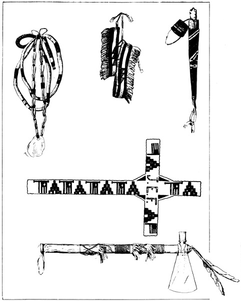 In the matter of these designs the white race has much it may learn from the Indian. Sometimes I have looked upon the patterns and colors of our wallpapers, our rugs, our carpets, our chintzs, our calicoes, 244 and especially upon the wool work or embroidery of some women, and have been compelled to ask myself if hideousness could be carried to any further extent. Some of the designs were the absolute delirium tremens of craziness,—conventionality reconventionalized again and again, until it was made unlike to anything in “the heavens above, the earth beneath, or the waters under the earth.”