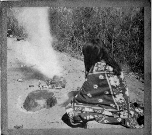 Nor is this all. The Indian’s every-day attitude is one of reverence for the Powers Above. He does everything with these before his mind. The first thing he does on awakening is to propitiate all the powers of the five or seven cardinal points. When the sun 255 rises he makes his offering to the powers behind it, that control and direct it, that it may be a blessing throughout the day. Indeed, every act of his life may be said to have a religious thought attached to it, so powerfully is the religious instinct developed within him. If you offer him a cigarette he will propitiate the Powers Above and Around and Below before he gives himself up to the full enjoyment of it. He does this, however, with such apparent unconcern that the stranger would never dream of it, even though he were looking straight at him. But the knowing will understand. When he sees the Indian quietly blow a puff of smoke to the East, he knows that is for the purpose of reminding the good and evil powers that reside there 256 that the smoker wishes their good influences to rest upon him, or, at least, that the evil influences shall pass him by. And the same thing when the smoker puffs to the North, the West, the South, and the Here. For the Navaho Indian believes that there are powers that need propitiating just here, while the Hopis add the powers of the Above and the Below, thus making seven cardinal points.