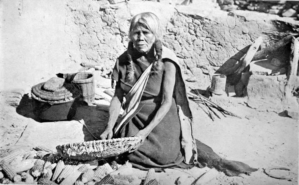 A SKILLED HOPI BASKET WEAVER.