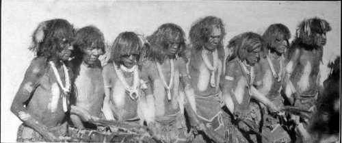 THE DIGNIFIED AND SOLEMN ROW OF SNAKE PRIESTS IN THE HOPI SNAKE DANCE CEREMONIES.