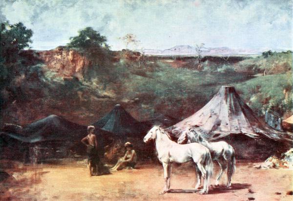 For a long time Fromentin’s rank as a painter was disputed. He proceeded peaceably on his way toward fortune and glory. His literary successes confirmed and enhanced his triumphs as a painter. Through his books his pictures became known and admired by the general public. In 1859, he obtained a First Class Medal and the Cross of the Legion of Honor. The emperor, Napoleon III., invited him to Compiègne. In 1869, his election as Officer of the Legion of Honor followed upon his exhibition of the Fantasia in Algeria and The Halt of the Muleteers. In 1868, he exhibited a very strange and disconcerting picture: Male and Female Centaurs practising at Archery. He wished to show by means of this work, which evoked much comment and criticism, that “the equestrian statue is the last word in human statuary.” “Mingle,” he wrote, “man and horse, give to the rest of the body the combined attributes of alertness and vigour, and you have a being which is supremely strong, thinking and acting, brave and swift, free, and yet docile.” Fromentin’s aristocratic instincts extended from men to things, and even to animals. It was he who in a certain sense discovered the horse, the Arab horse, fine and free, poet of the desert and the sun quite as much as his master. When Fromentin shows him to us with his long silvery tail and his mane quivering like waves, one would say that in the swift flight of his course the artist had lent him wings. “Nevertheless,” writes one critic, “in spite of his intimate acquaintance with the form and the varied coat of the Arab horse, it is perhaps in the little inaccuracies of his drawing of this animal that Fromentin betrays most obviously the defectiveness of his early studies.”