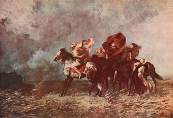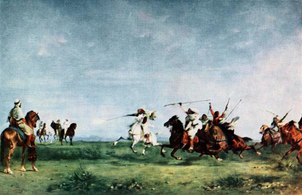 The Fantasia, for example, gives an admirable presentment of the open country around Algiers and of one aspect of Arab manners and customs. It shows us a numerous cavalcade galloping at headlong speed, with clamorous shouts and discharge of guns, across a broad plain toward a knoll on which the mounted emir sits in judgment. This mingling of motley garments and of horses galloping in all directions produces a scene of extraordinary animation and a liveliness of tone that contrasts sharply with the bare immensity of the plain and the uniformity of the sky.