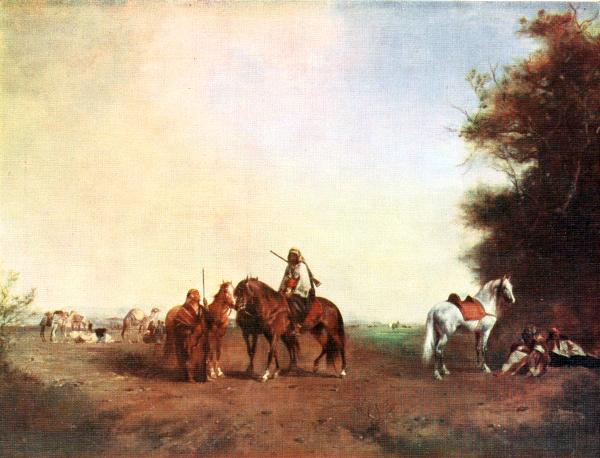 Jules Claretie was quite right in declaring that Marilhat brought back from the Orient landscapes imbued with profound melancholy, Decamps scenes distinguished for their dazzling brilliance, Delacroix spectacles of majestic grandeur, and that Fromentin in his turn discovered in that land of light a personal note which his predecessors would have sought in vain, since he carried it within himself. The colour scale of Fromentin is a subdued one; his favourite shades are the half-tones.
