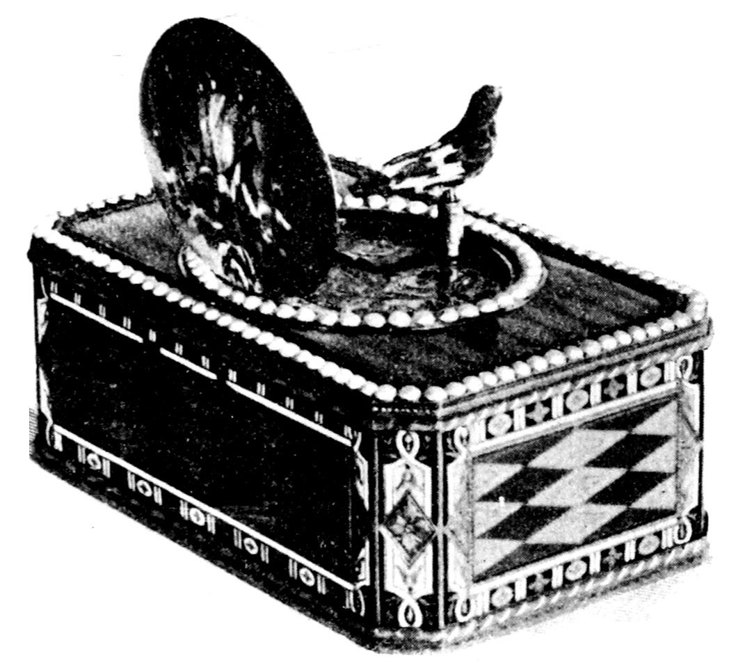 The characteristic of the antique singing bird snuff boxes, is that the bird, when singing and moving its wings, opens its beak, when turning the head. It is unfortunate to say, that modern watchmakers have not acquired the skilfulness of their predecessors, and that in modern boxes this triple movement can no more be obtained. This is, as a matter of fact, one of the first means of distinguishing an antique bird box, from a modern one.—