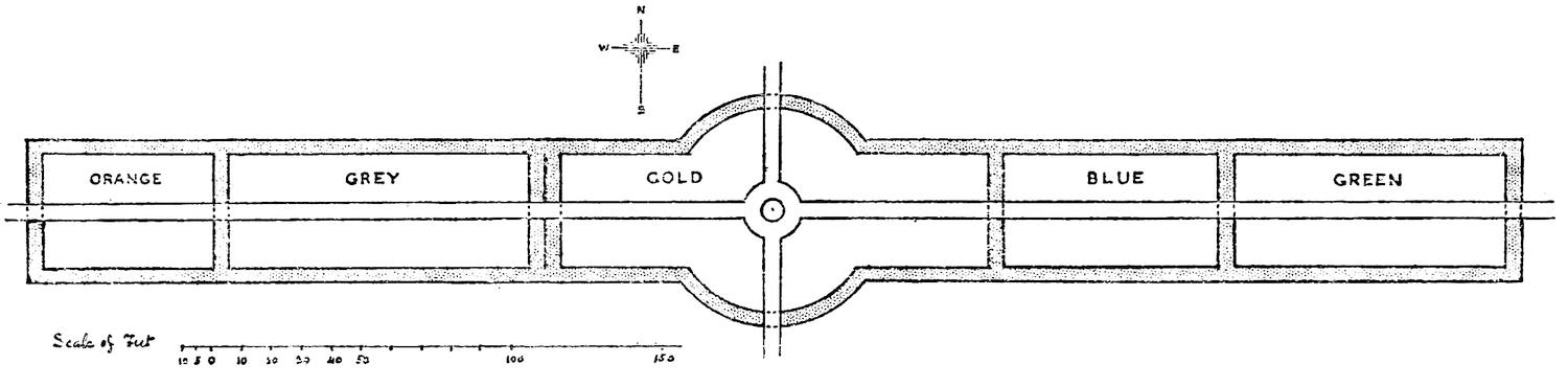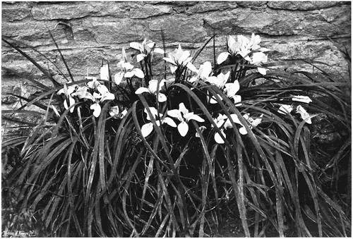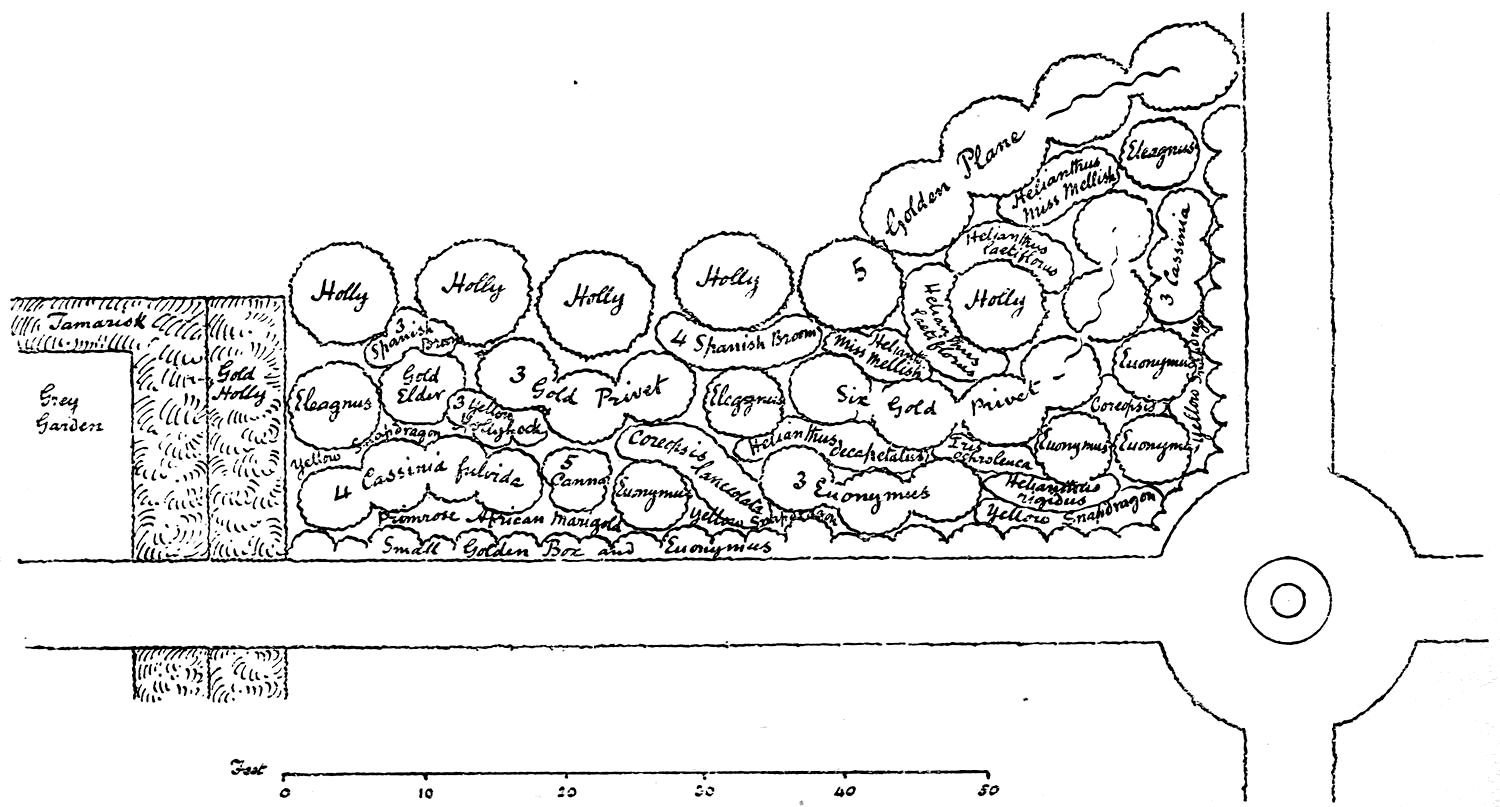 Now the colours change to white and yellow and golden foliage, with the pretty little pale trumpet Daffodil Consul Crawford, and beyond it the stronger yellow of two other small early kinds—N. nanus and the charming little N. minor, quite distinct though so often confounded with nanus in gardens. With these, and in other strips and patches towards the end of the7 border, are plantings of the Golden Valerian, so useful for its bright yellow foliage quite early in the year. The leaves of the Orange Day-lily are also of a pale yellowish green colour when they first come up, and are used at the end of the border. These plants of golden and pale foliage are also placed in a further region beyond the plan, and show to great advantage as the eye enfilades the border and reaches the more distant places. Before the end of the bulb-border is reached there is once more a drift of harmonised faint pink colouring of Megasea and the little Fumaria (also known as Corydalis bulbosa) with the pale early Pyrenean Daffodil, N. pallidus præcox.