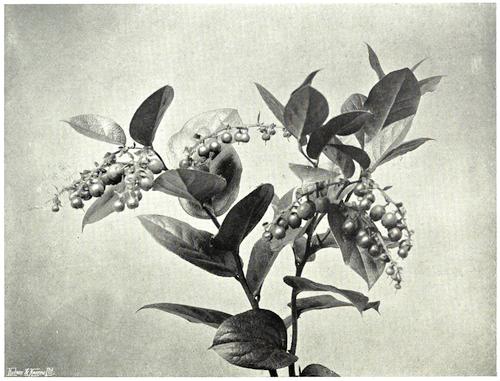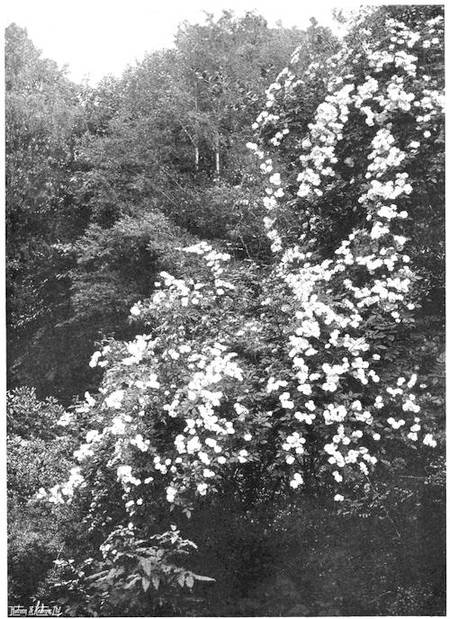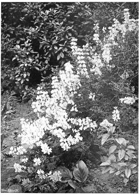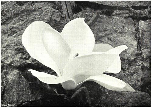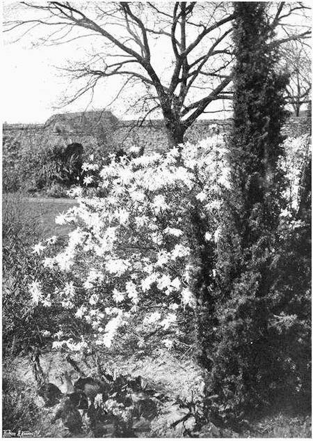Now we pass among some shrub-clumps, and at the end come upon a cheering sight; a tree of Magnolia conspicua bearing hundreds of its great white cups of fragrant bloom. Just before reaching it, and taking part with it in the garden picture, are some tall bushes of Forsythia suspensa, tossing out many-feet-long branches loaded with their burden of clear yellow flowers. They are ten to twelve feet high, and one looks up at much of the bloom clear-cut against the5 pure blue of the sky; the upper part of the Magnolia also shows against the sky. Here there is a third flower-picture; this time of warm white and finest yellow on brilliant blue, and out in open sunlight. Among the Forsythias is also a large bush of Magnolia stellata, whose milk-white flowers may be counted by the thousand. As the earlier M. conspicua goes out of bloom it comes into full bearing, keeping pace with the Forsythia, whose season runs on well into April.
