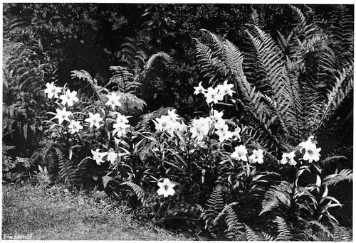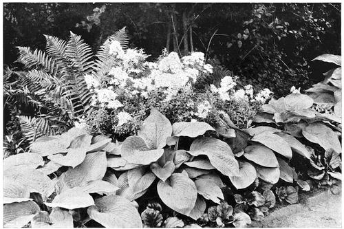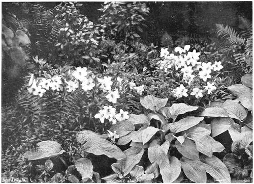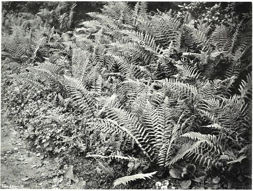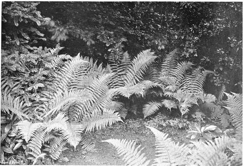 Through April and May the leaves of the bulbs are growing tall, and their seed-pods are carefully removed to prevent exhaustion. By the end of May the Ferns are throwing up their leafy crooks; by June the feathery fronds are displayed in all their tender freshness; they spread over the whole bank, and we forget that there are any bulbs between. By the time the June garden, whose western boundary it forms, has come into fullest bloom it has become a completely furnished bank of Fern-beauty.