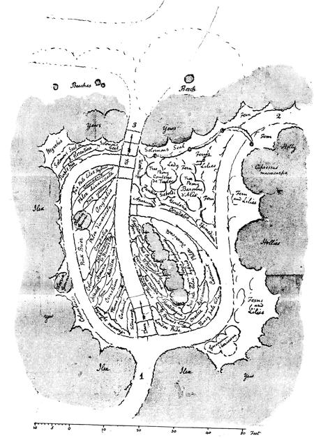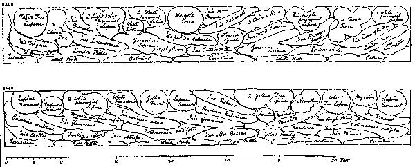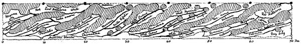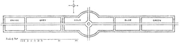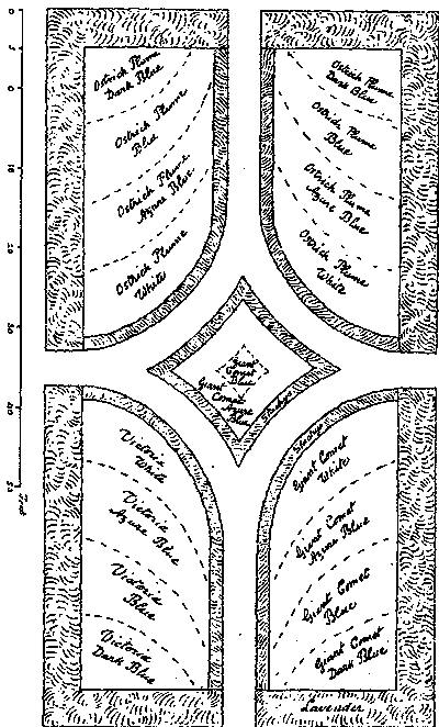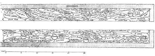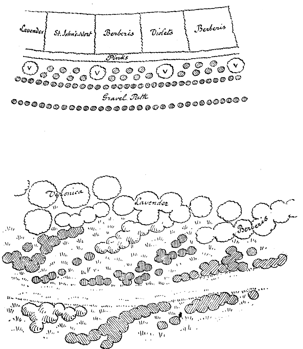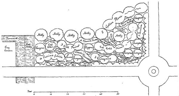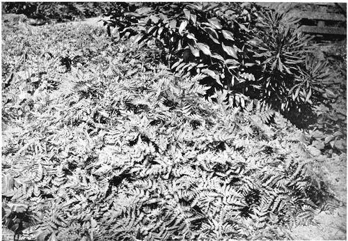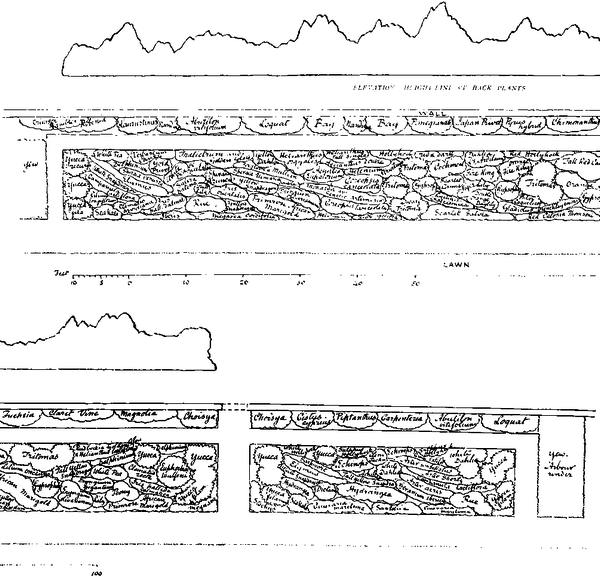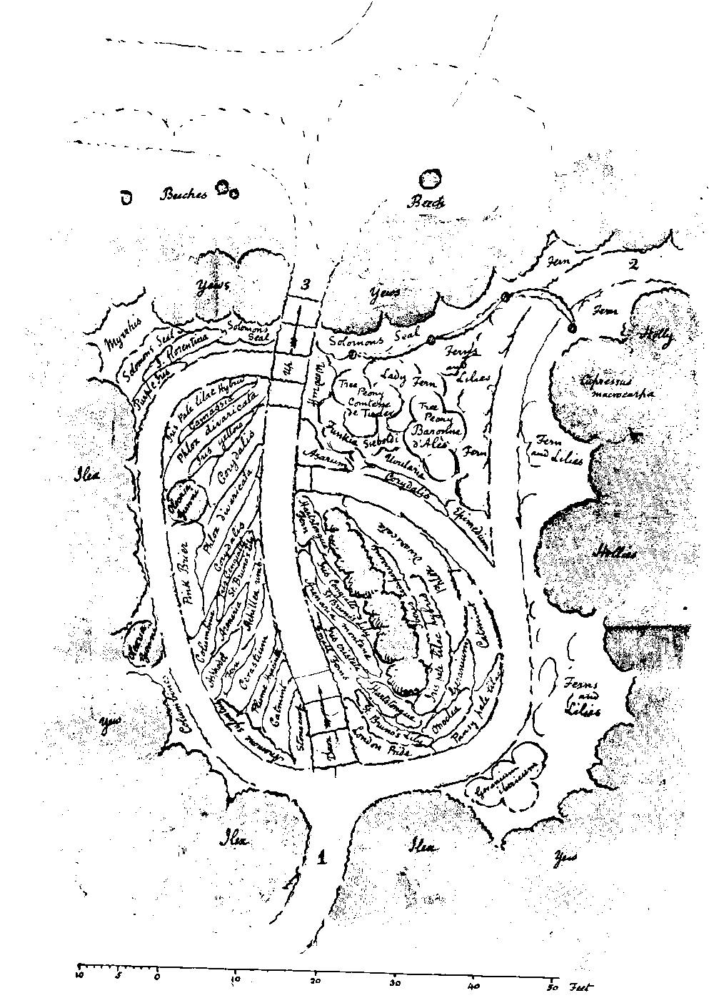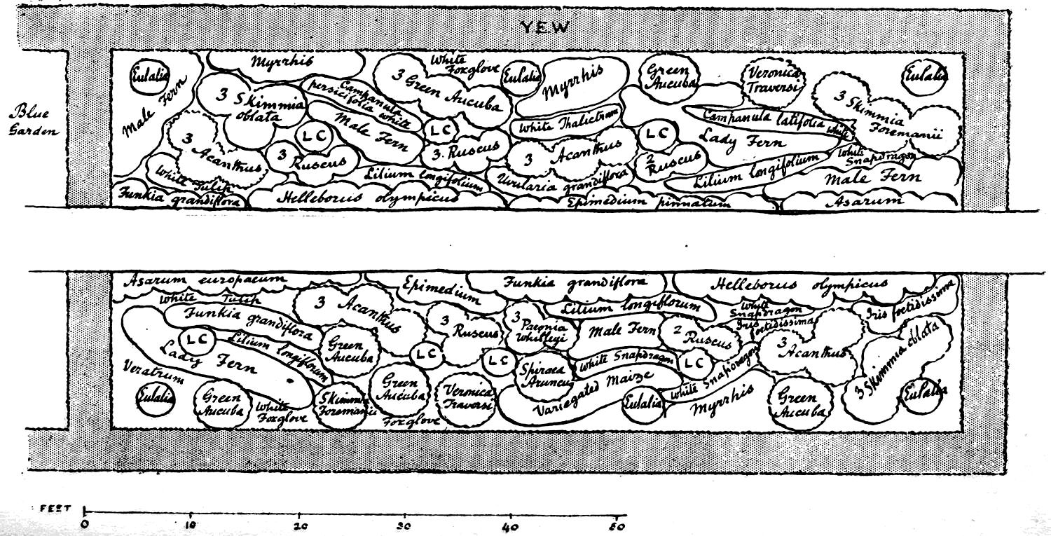 On the further side of a path that bounds my June garden is a border about seventy feet long and ten feet wide. At every ten feet along the back is a larch post planted with a free-growing Rose. These are not only to clothe their posts but are to grow into garlands swinging on slack chains from post to post. Beyond are Bamboos, and then an old hedge-bank6 with Scotch Firs, Oaks, Thorns, &c. The border slopes upwards from the path, forming a bank of gentle ascent. It was first planted with hardy Ferns in bold drifts; Male Fern for the most part, because it is not only handsome but extremely persistent; the fronds remaining green into the winter. The Fern-spaces are shown in the plan by diagonal hatching; between them come the bulbs, with a general edging to the front of mossy Saxifrage.