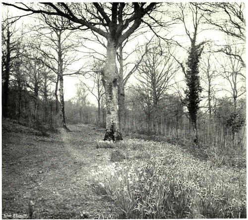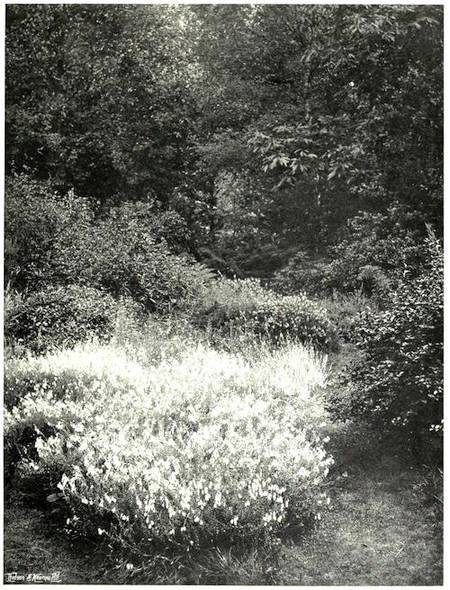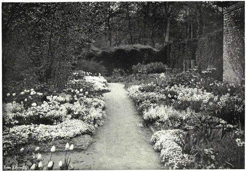 It is the year's first complete picture of flower-effect in the woodland landscape. The place is not very far from the house, in the nearest hundred yards of the copse; where flowers seem to be more in place than further away. Looking to the left, the long ridge and south slope of the house-roof is seen through the leafless trees, though the main wall-block is hidden by the sheltering Hollies and Junipers.
