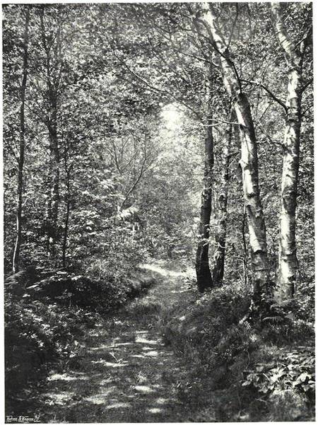Now we pass on through the dark masses of Rhododendron and the Birches that shoot up among them. How the silver stems, blotched and banded with varied browns and greys so deep in tone that they show like a luminous black, tell among the glossy Rhododendron green; and how strangely different is the way of growth of the two kinds of tree; the tall white trunks4 spearing up through the dense, dark, leathery leaf-masses of solid, roundish outline, with their delicate network of reddish branch and spray gently swaying far overhead!