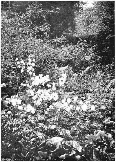 The only way in which variety of aspect was deliberately chosen was in the way of thinning out the natural growths. It was a wood of seedling trees that had come up naturally after an old wood of Scotch Fir had been cut down, and it seemed well to clear away all but one, or in some cases two kinds of trees in the several regions. Even in this the intention was to secure simplicity rather than variety, so that in moving about the ground there should be one thing at a time to see and enjoy. It is just this quality of singleness or simplicity of aim that I find wanting in gardens in general, where one may see quantities of the best plants grandly grown and yet no garden pictures.