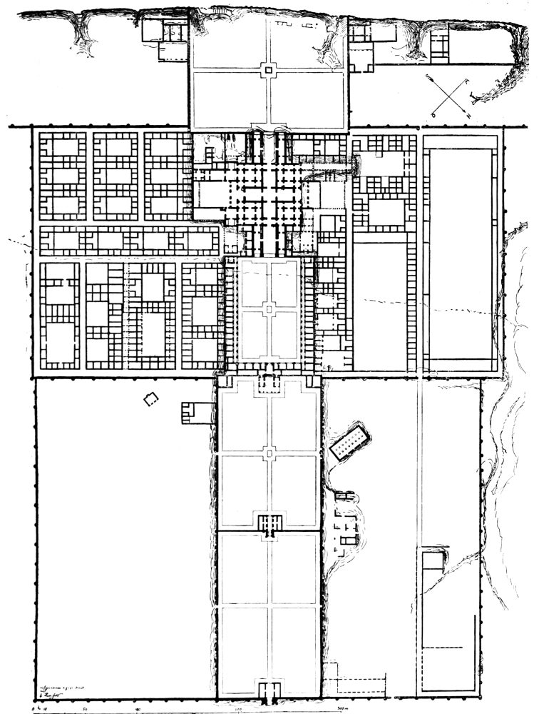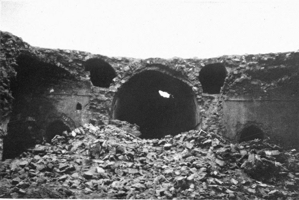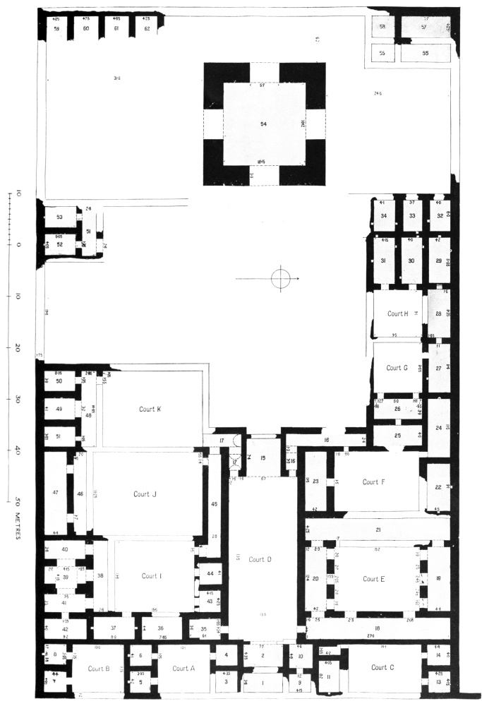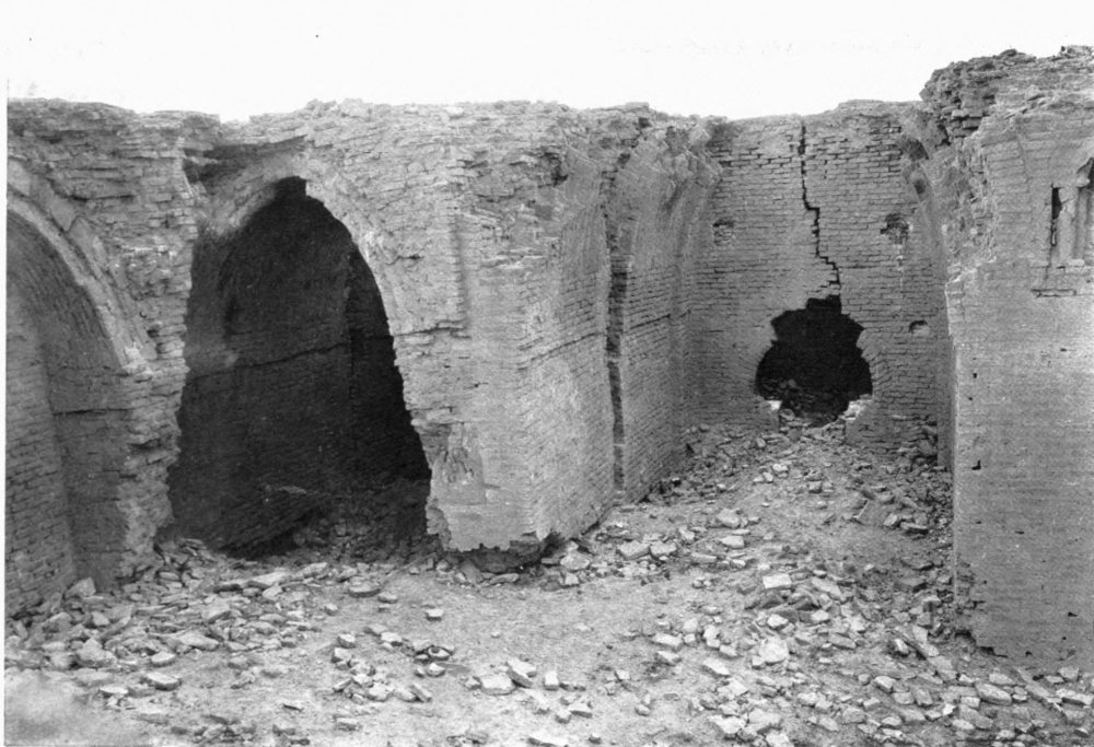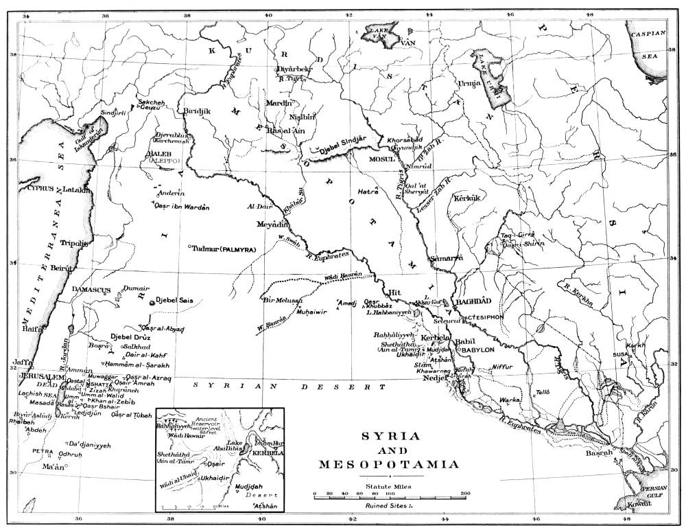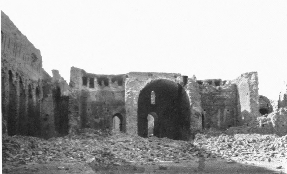 M. Massignon was, however, the first to make any record of Ukhaiḍir. His preliminary notes, together with a plan and some photographs, were published in the Bulletin de l’Académie des Inscriptions et Belles-Lettres of March 1909, and in the Gazette des Beaux-Arts of April 1909. The next visitor to the palace was myself. I left Aleppo in February 1909 and reached Ukhaiḍir on March 25, travelling by the east bank of the Euphrates and across the desert from Hît via Kubaisah and Shethâthâ. I had no knowledge of M. Massignon’s journey, neither did the Arabs, who were at that time inhabiting the place, give me any information concerning him. I did not hear of his discovery until I reached Constantinople in the following July. M. Massignon followed up his observations with the first volume of his Mission en Mésopotamie (published in 1910), which was concerned chiefly with Ukhaiḍir. I, in the meantime, had published a paper on the vaulting system of the palace in the Journal of Hellenic Studies for 1910 (p. 69), and I gave a more detailed account of the building in the following year (Amurath to Amurath, p. 140). I returned to the site in March 1911, in order to correct my plans and to take measurements for elevations and sections. Going thence to Babylon, I found that some of the members of the Deutsche Orient-Gesellschaft who were engaged upon the excavations there had been to Ukhaiḍir during the two years of my absence and were preparing a book upon it. They were so kind as to show me their drawings while I was at Babylon, and I had the advantage of discussing with them my conjectures and difficulties, and the satisfaction of finding that we were in agreement on all important points. Their book appeared in 1912 (Dr. Reuther, Ocheïdir, published by the Deutsche Orient-Gesellschaft), and is referred to frequently in this volume. For their generosity in allowing me to use some of their architectural drawings, I tender my grateful thanks, together with my respectful admiration for their masterly production.