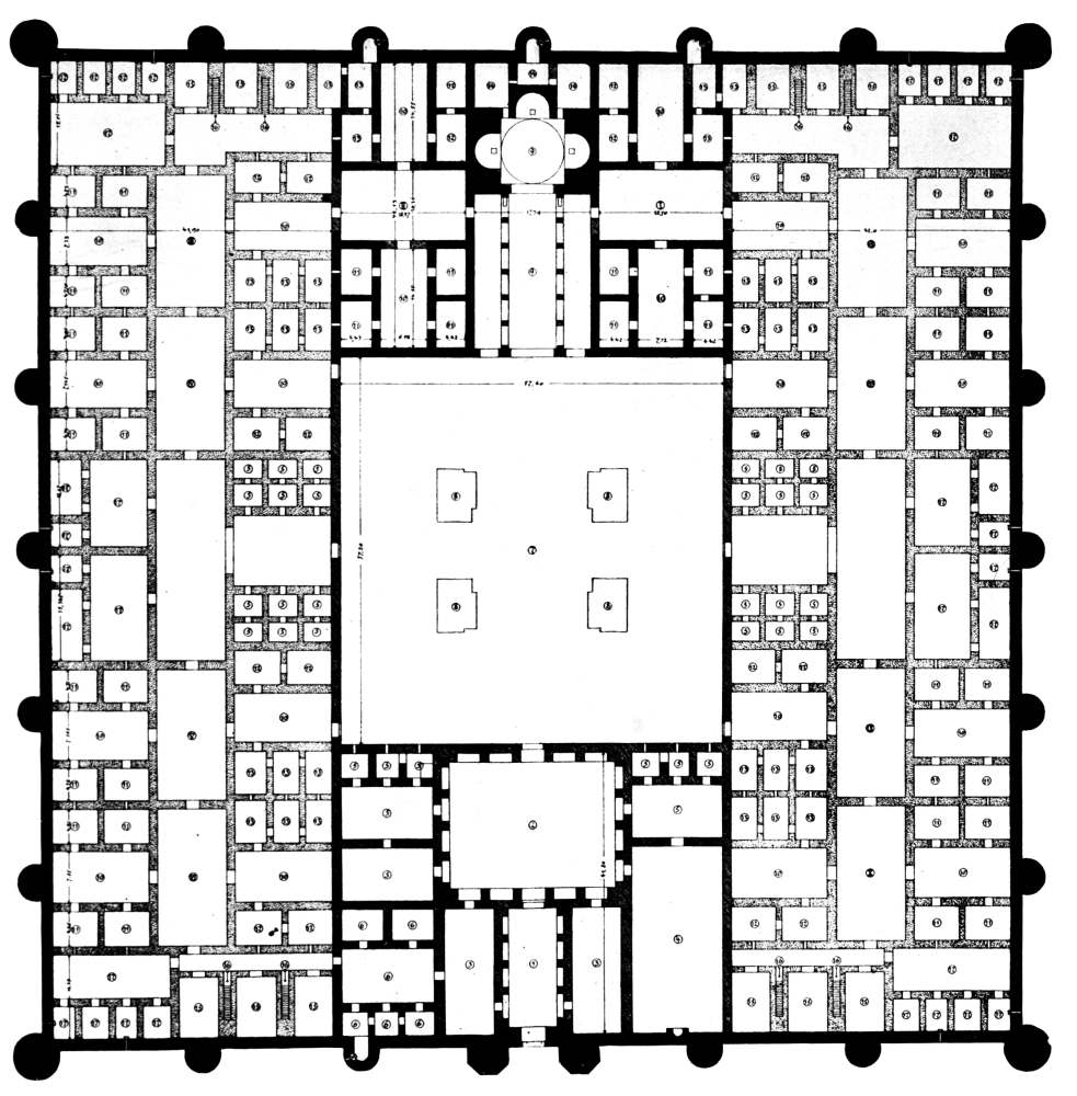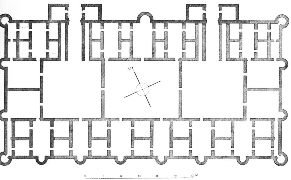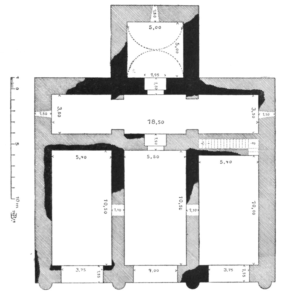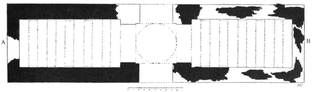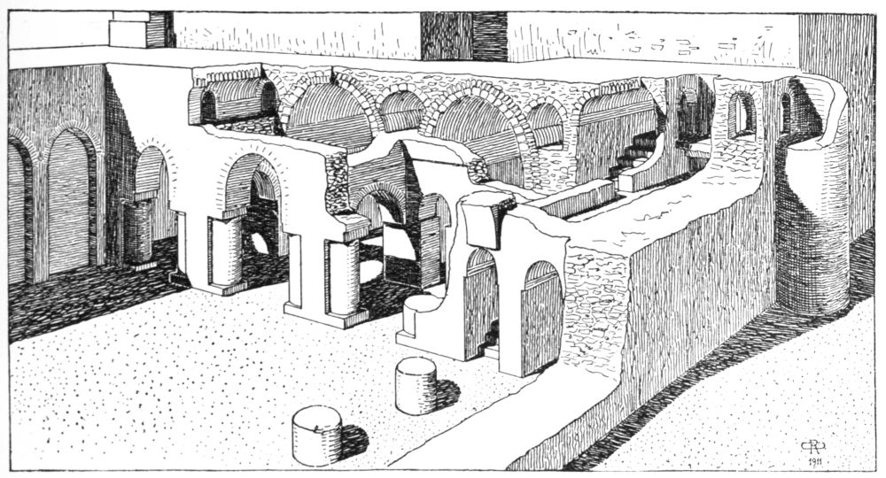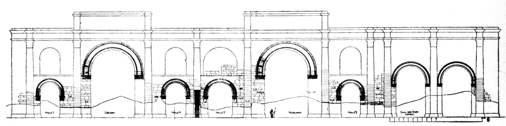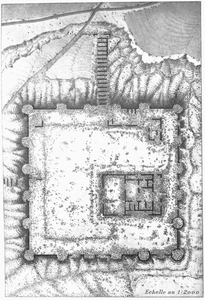 M. Massignon was, however, the first to make any record of Ukhaiḍir. His preliminary notes, together with a plan and some photographs, were published in the Bulletin de l’Académie des Inscriptions et Belles-Lettres of March 1909, and in the Gazette des Beaux-Arts of April 1909. The next visitor to the palace was myself. I left Aleppo in February 1909 and reached Ukhaiḍir on March 25, travelling by the east bank of the Euphrates and across the desert from Hît via Kubaisah and Shethâthâ. I had no knowledge of M. Massignon’s journey, neither did the Arabs, who were at that time inhabiting the place, give me any information concerning him. I did not hear of his discovery until I reached Constantinople in the following July. M. Massignon followed up his observations with the first volume of his Mission en Mésopotamie (published in 1910), which was concerned chiefly with Ukhaiḍir. I, in the meantime, had published a paper on the vaulting system of the palace in the Journal of Hellenic Studies for 1910 (p. 69), and I gave a more detailed account of the building in the following year (Amurath to Amurath, p. 140). I returned to the site in March 1911, in order to correct my plans and to take measurements for elevations and sections. Going thence to Babylon, I found that some of the members of the Deutsche Orient-Gesellschaft who were engaged upon the excavations there had been to Ukhaiḍir during the two years of my absence and were preparing a book upon it. They were so kind as to show me their drawings while I was at Babylon, and I had the advantage of discussing with them my conjectures and difficulties, and the satisfaction of finding that we were in agreement on all important points. Their book appeared in 1912 (Dr. Reuther, Ocheïdir, published by the Deutsche Orient-Gesellschaft), and is referred to frequently in this volume. For their generosity in allowing me to use some of their architectural drawings, I tender my grateful thanks, together with my respectful admiration for their masterly production.