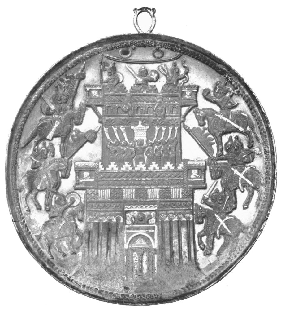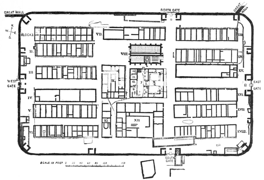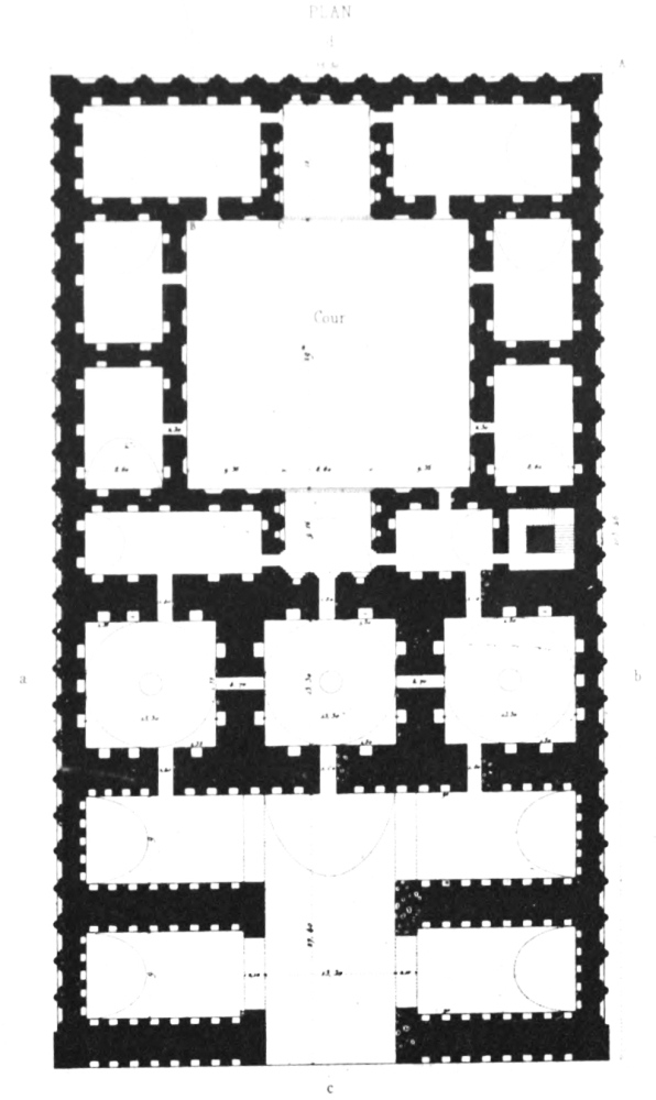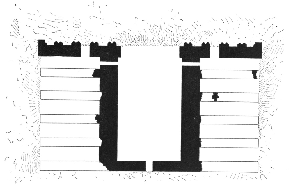 Scarcely more correct as to architectural features is Tavernier’s allusion to Ukhaiḍir. There can, however, be no doubt that it is to Ukhaiḍir that he refers, by reason of the geographical position of his ‘grand Palais’. Coming from Aleppo, he turned off at ‘Ânah into the desert and after some twenty days of journeying he observes:[3] ‘Cinq jours aprés que nous eûmes quitté ces deux familles Arabes, nous découvrîmes un grand Palais tout de brique cuite au feu; et il y a de l’apparence que le pays a esté autrefois semé, et que les fourneaux où on a cuit cette brique ont esté chauffez avec du chaume:{x} car à quinze ou vingt lieües à la ronde il n’y a pas une brossaille ni un brin de bois. Chaque brique est d’un demi-pied en quarré et épaisse de six pouces. Il y a dans ce Palais trois grandes cours, et dans chacune de beaux bastimens avec deux rangs d’arcades qui sont l’un sur l’autre. Quoy que ce grand Palais soit encore entier, il est toutefois inhabité, et les Arabes fort ignorans de l’antiquité ne me sceurent apprendre pour qui il a esté basti, ny d’autres singularitez dont je m’informay, et dont j’aurois bien voulu qu’ils m’eussent instruit. Devant la porte de ce Palais il y a un étang accompagné d’un canal qui est à sec. Le fond du canal est de brique, de mesme que la voûte qui est à fleur de terre, et les Arabes croyent que c’a esté un conduit par lequel on faisoit passer l’eau de l’Euphrate. Pour moy je ne sçaurois qu’en juger, et ne puis comprendre comme on pouvoit faire venir de l’eau de si loin, l’Euphrate estant éloigné de ce lieü-là de plus de vingt lieües. De ce Palais nous tirâmes au nord est et après une marche de quatre jours nous arrivâmes à un méchant bourg, autrefois nommé Cufa et à present Meched-Ali.’[4]