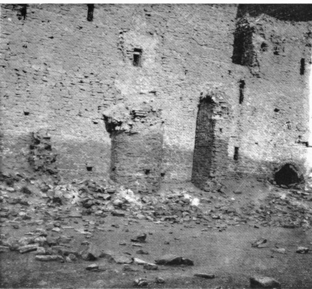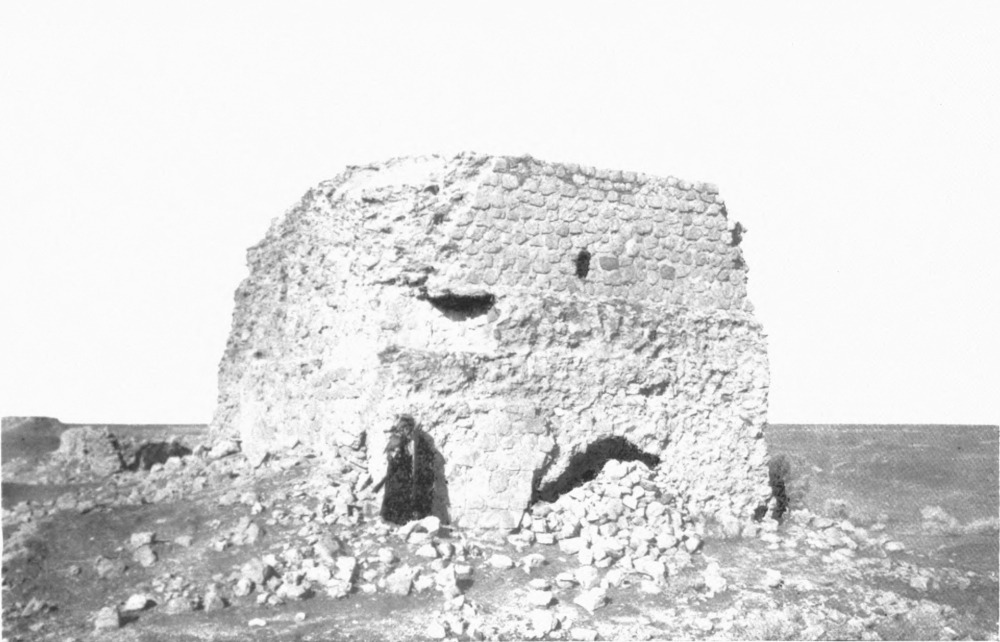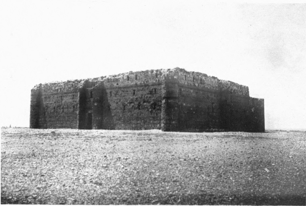 The palace of Ukhaiḍir was practically unknown until the winter of 1908-9, although it had been seen by European travellers as early as the seventeenth{ix} century. Della Valle passed by it in June 1625 on his way from Baṣrah to Aleppo, and described it as ‘a great ancient fabric, perfectly square, with thirteen pilasters or round columns on each side without, and other compartments of arches; within which were many chambers, with a court of no great bigness and uncovered. The Arabians call this fabric Casr Chaider. I could not conjecture whether it had been a palace or temple or castle; but I incline to believe it a palace rather than anything else.’[1] Pedro Teixeira’s account is doubtful. He says:[2] ‘At eleven in the morning we came to a dry channel which in winter they say has much water, and I thought it likely by the nature of its situation and capaciousness. Over it, on a rising ground, is still an ancient square fort, with twelve bastions, three on each side, made of burnt brick and lime, strong and well built. Without it, at about sixty paces distance, is a small Alcoran, or Tower, ten cubits high, tho’ it appears to have been higher, of the same structure, all decay’d with age; yet it appears to be a royal fabrick by its goodness and the place it stands in, where it could not be raised without mighty cost and much labour, and difficulty. It was done by an Arabian king, grandfather to Xeque Mahamed Eben Raxet, whom I said before I was carried to see, to secure the caravans going that way before the Turks possess’d themselves of Bagdat and Bazora. The Arabs call it Alcayzar or Kayzar, which signifies a palace or Cesar’s House, for so they call all that belong to kings and princes. This they reckon the half-way from Bazora to Mexat Aly, whither we were going. We found some small wells in this channel, the water of them clear and fresh, but of an intolerable ill scent, yet necessity prevail’d.’ The only item in this description which connects Teixeira’s palace with Ukhaiḍir is the name. Teixeira reached Meshhed ‘Ali (Nedjef) six days after he had passed by Alcayzar and he gives the situation of the palace as half-way between Baṣrah and Nedjef, whereas Ukhaiḍir lies to the north-west of Nedjef. There is no ‘Alcoran’, i.e. minaret, at Ukhaiḍir, neither could the building be described, even by the least careful observer, as a square fort with three bastions on each side. I am therefore inclined to suppose that there is another ruin called Ukhaiḍir further to the south. We need not linger over the derivation which he assigns to the name.