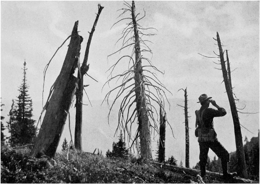 The work of a Forest Ranger is, first of all, to protect the District committed to his charge against fire. That comes before all else. For that purpose, the Ranger patrols his District during the seasons when fires are dangerous, or watches for signs of fire from certain high points, called fire-lookouts, or both. He keeps the trails and fire lines clear and the telephone in working order, and sees to it that the fire fighting tools, such as spades, axes, and rakes, are in good condition and ready for service. If he is wise, he establishes such relations with the people who live in his neighborhood that they become his volunteer assistants in watching for forest fires, in taking precautions against them, and in notifying him of them when they do take place.