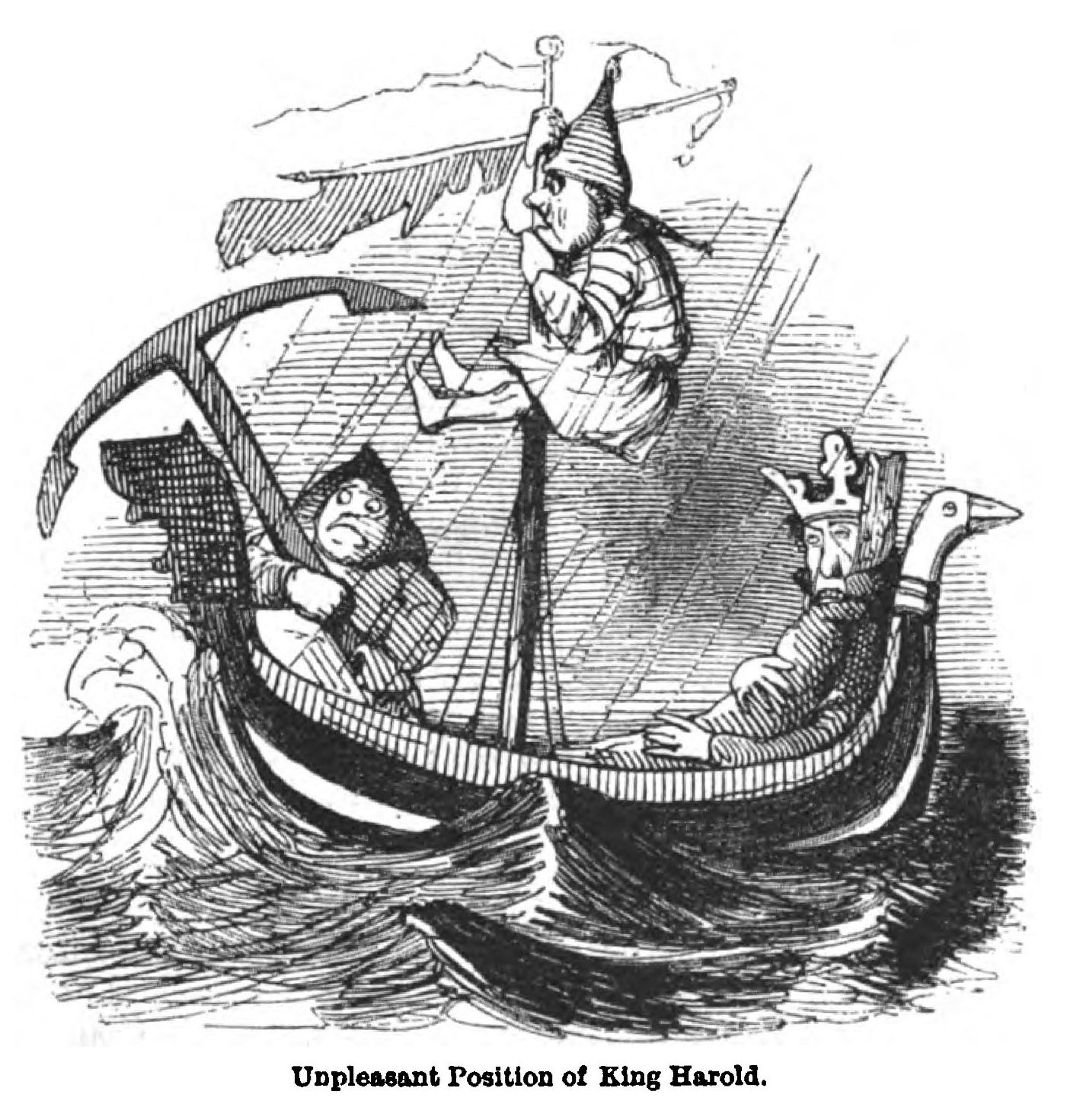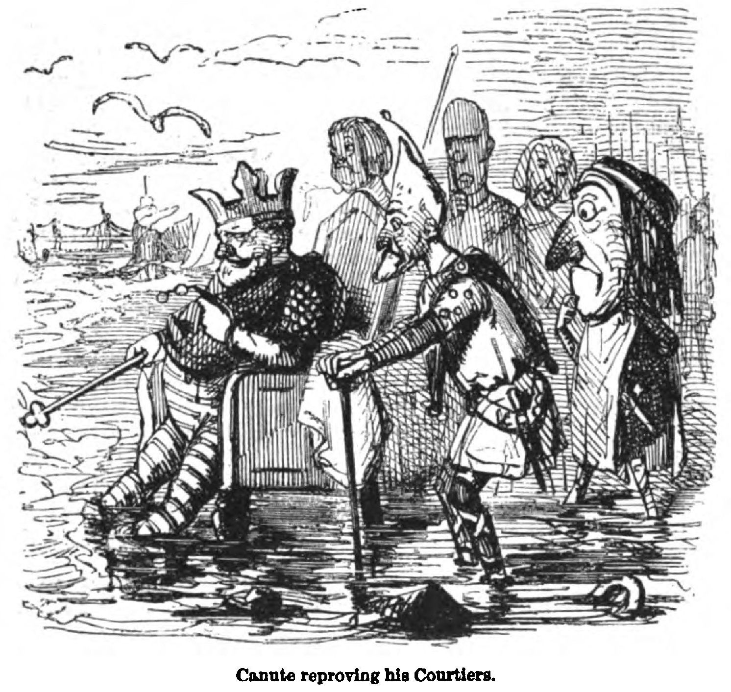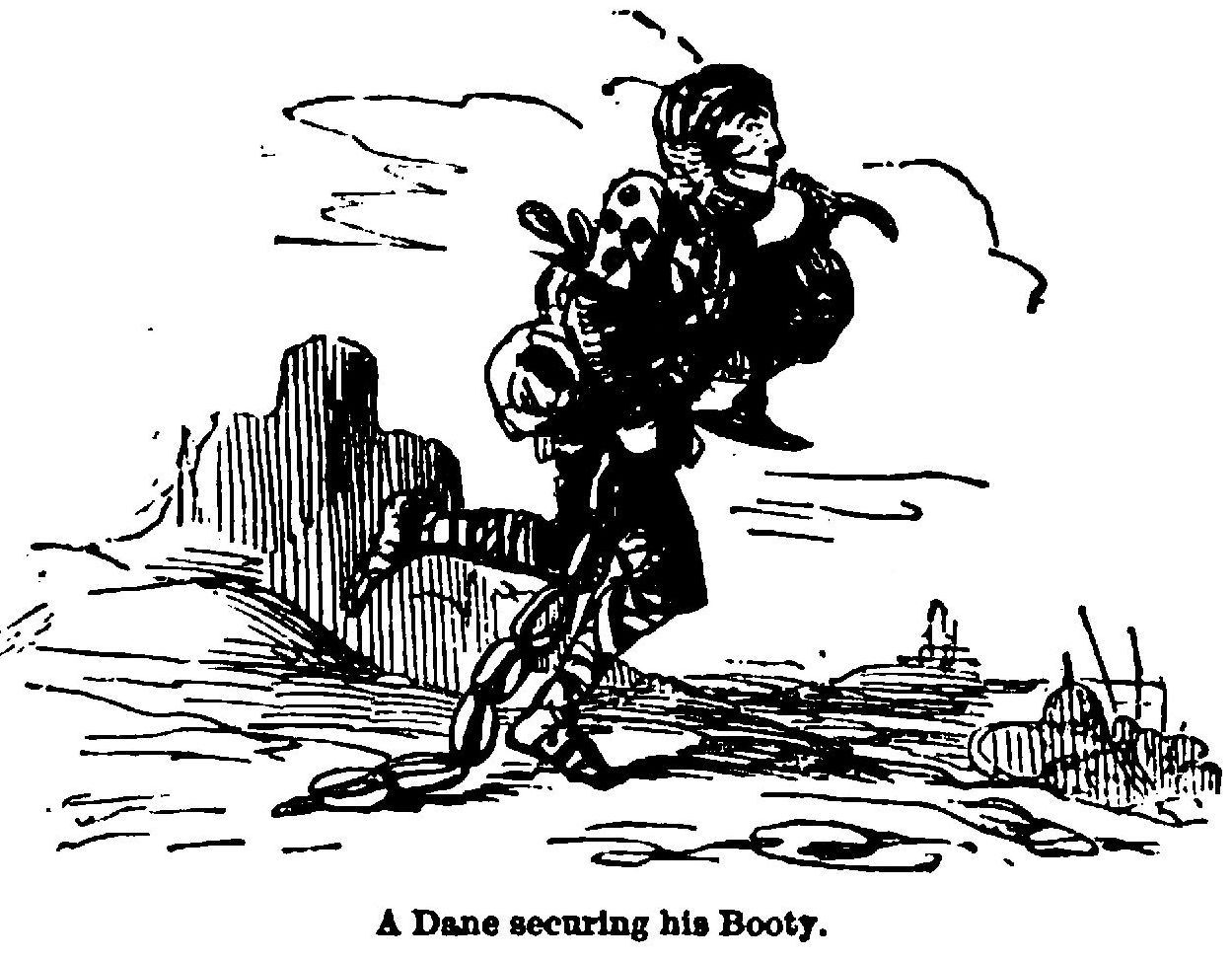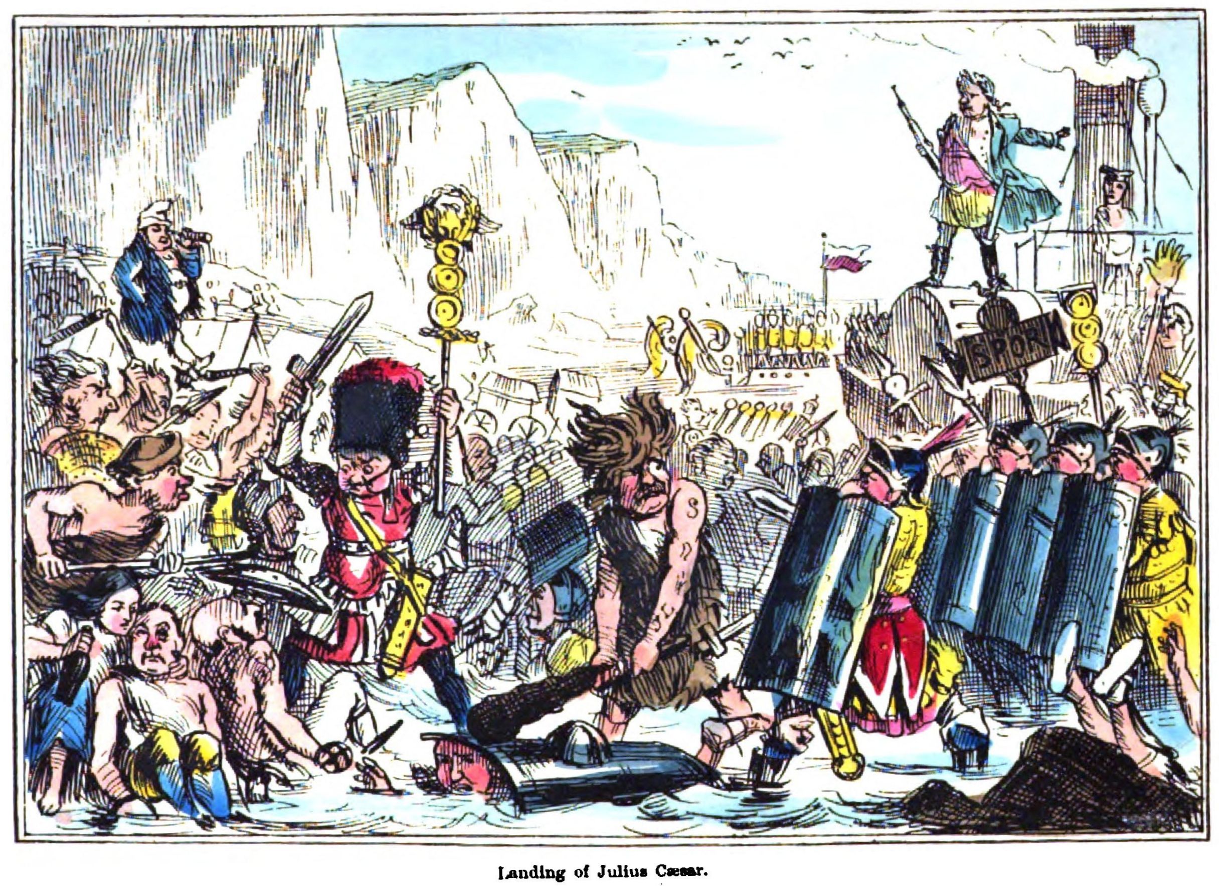 Whatever Caesar looking for the Pearls for which Britain was formerly celebrated, may have been Caesar's motives the fact is pretty well ascertained, that at about ten o'clock one fine morning in August—some say a quarter past—he reached the British coast with 12,000 infantry, packed in eighty vessels. He had left behind him the whole of his cavalry—the Roman horse-marines—who were detained by contrary winds on the other side of the sea, and though anxious to be in communication with their leader, they never could get into the right channel. At about three in the afternoon, Cæsar having taken an early dinner, began to disembark his forces at a spot called to this day the Sandwich Flats, from the people having been such flats as to allow the enemy to effect a landing. While the Roman soldiers were standing shilly-shallying at the side of their vessels, a standard-bearer of the tenth legion, or, as we should call him, an ensign in the tenth, jumped into the water, which was nearly up to his knees, and addressing a claptrap to his comrades as he stood in the sea, completely turned the tide in Caesar's favour. After a severe shindy on the shingles, the Britons withdrew, leaving the Romans masters of the beach, where Cæsar erected a marquee for the accommodation of his cohorts. The natives sought and obtained peace, which had no sooner been concluded, than the Roman horse-marines were seen riding across the Channel. A tempest, however, arising, the horses were terrified, and the waves beginning to mount, added so much to the confusion, that the Roman cavalry were compelled to back to the point they started from. The same storm gave a severe blow to the camp of Cæsar, on the beach, dashing his galleys and transports against the rocks which they were sure to split upon. Daunted by these disasters, the invaders, after a few breezes with the Britons, took advantage of a favourable gale to return to Gaul, and thus for a time the dispute appeared to have blown over.