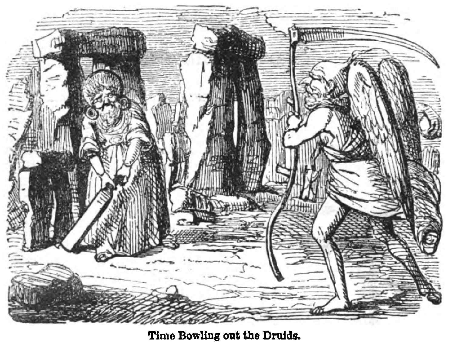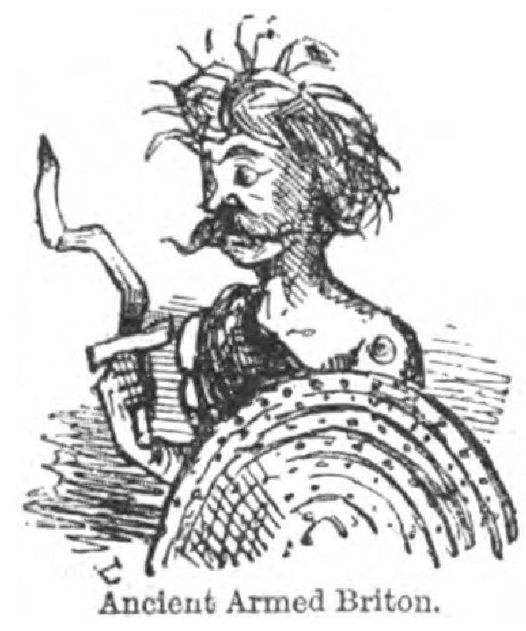The best materials for getting at the early history of a country are its coins, its architecture, and its manners. The Britons, however, had not yet converted the Britannia metal—for which their valour always made them conspicuous—into coins, while their architecture, to judge from the Druidical remains, was of the wicket style, consisting of two or three stones stuck upright in the earth, with another stone laid at the top of them; after the fashion with which all lovers of the game of cricket are of course familiar. As this is the only architectural assistance we are likely to obtain, we decline entering upon the subject through such a gate; or, to use an expression analogous to the pastime to which we have referred, we refuse to take our innings at such a wicket. We need hardly add, that in looking to the manners of our ancestors for enlightenment, we look utterly in vain, for there is no Druidical Chesterfield to afford us any information upon the etiquette of that distant period. There is every reason to believe that our forefathers lived in an exceedingly rude state; and it is therefore perhaps as well that their manners—or rather their want of manners—should be buried in oblivion.