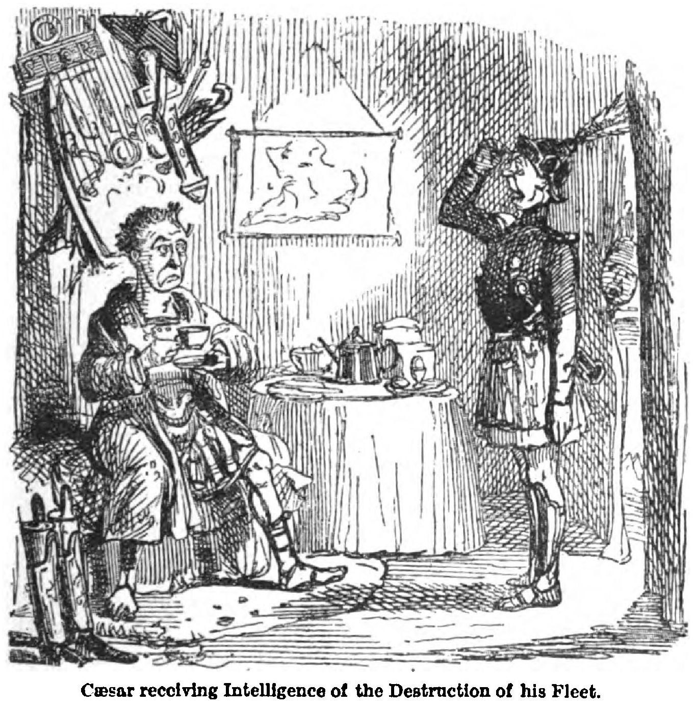 Cæsar's thoughts, however, still continued to run in one, namely, the British, Channel. In the spring of the ensuing year, he rigged out 800 ships, into which he contrived to cram 32,000 men, and with this force he was permitted to land a second time by those horrid flats at Sandwich. The Britons for some time made an obstinate resistance in their chariots, but they ultimately took a fly across the country, and retreated with great rapidity. Cæsar had scarcely sat down to breakfast the next morning when he heard that a tempest had wrecked all his vessels. At this intelligence he burst into tears, and scampered off to the sea coast, with all his legions in full cry, hurrying after him.