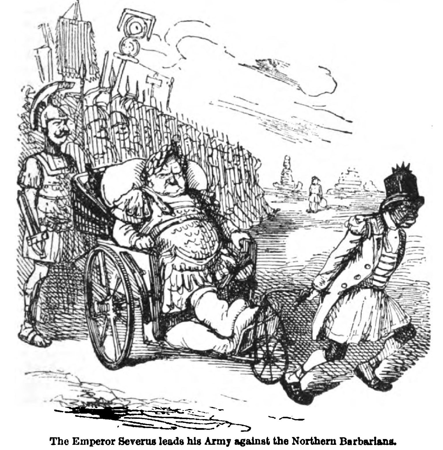 After a series of successes, Ostorius having suffocated every breath of liberty in Suffolk, and hauled the inhabitants of Newcastle over the coals, drove the people of Wales before him like so many Welsh rabbits; and even the brave Caractacus was obliged to fly as well as he could, with the remains of one of the wings of the British army. He was taken to Rome with his wife and children, in fetters, but his dignified conduct procured his chains to be struck off, and from this moment we lose the chain of his history.