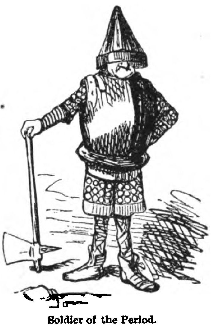 Before quitting the subject of Caesar's invasion, it may be interesting to the reader to know something of the weapons with which the early Britons attempted to defend themselves. Their swords were made of copper, and generally bent with the first blow, which must have greatly straitened their aggressive resources, for the swords thus followed their own bent, instead of carrying out the intentions of the persons using them. This provoking pliancy of the material must often have made the soldier as ill-tempered as his own weapon. The Britons carried also a dirk, and a spear, the latter of which they threw at the foe, as an effectual means of pitching into him. A sort of reaping-hook was attached to their chariot wheels, and was often very useful in reaping the laurels of victory.