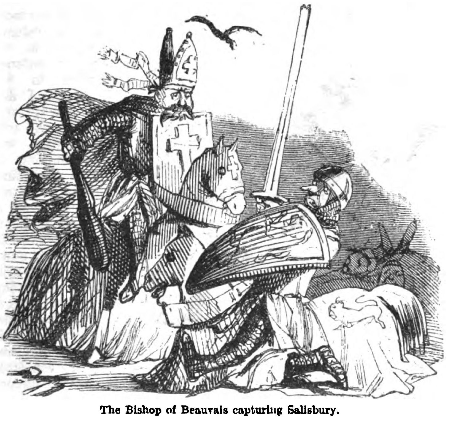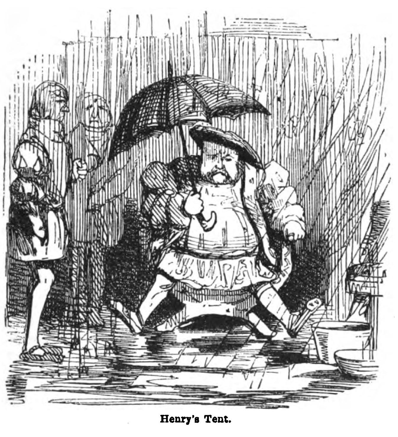 The news of the disaster turned out to be no exaggeration, for there were no penny-a-liners in those days; and, having carried his ships a good way inland, where they remained like fish out of water, he set out once more in pursuit of the enemy. The Britons had, however, made the most of their time, and had found a leader in the person of Gassivelaunus, alias Caswallon, a quarrelsome old Gelt, who had so frequently thrashed his neighbours, that he was thought the most likely person to succeed in thrashing the Romans. This gallant individual was successful in a few rough off handed engagements; but when it came to the fancy work, where tactics were required, the disciplined Roman troops were more than a match for him. His soldiers having been driven back to their woods, he drove himself back in his chariot to the neighbourhood of Chertsey, where he had a few acres of ground, which he called a Kingdom. He then stuck some wooden posts in the middle of the Thames, as an impediment to Cæsar, who, in the plenitude of his vaulting ambition, laid his hands on the posts and vaulted over them.