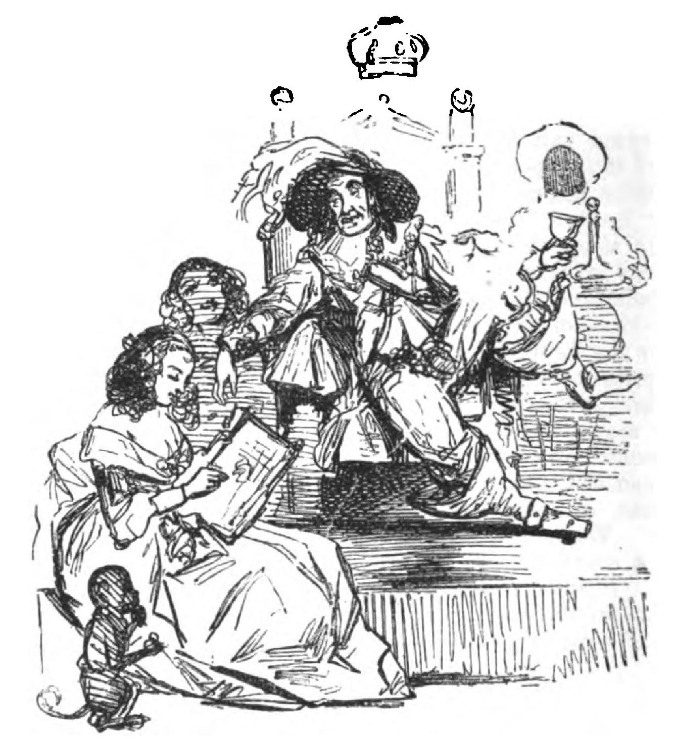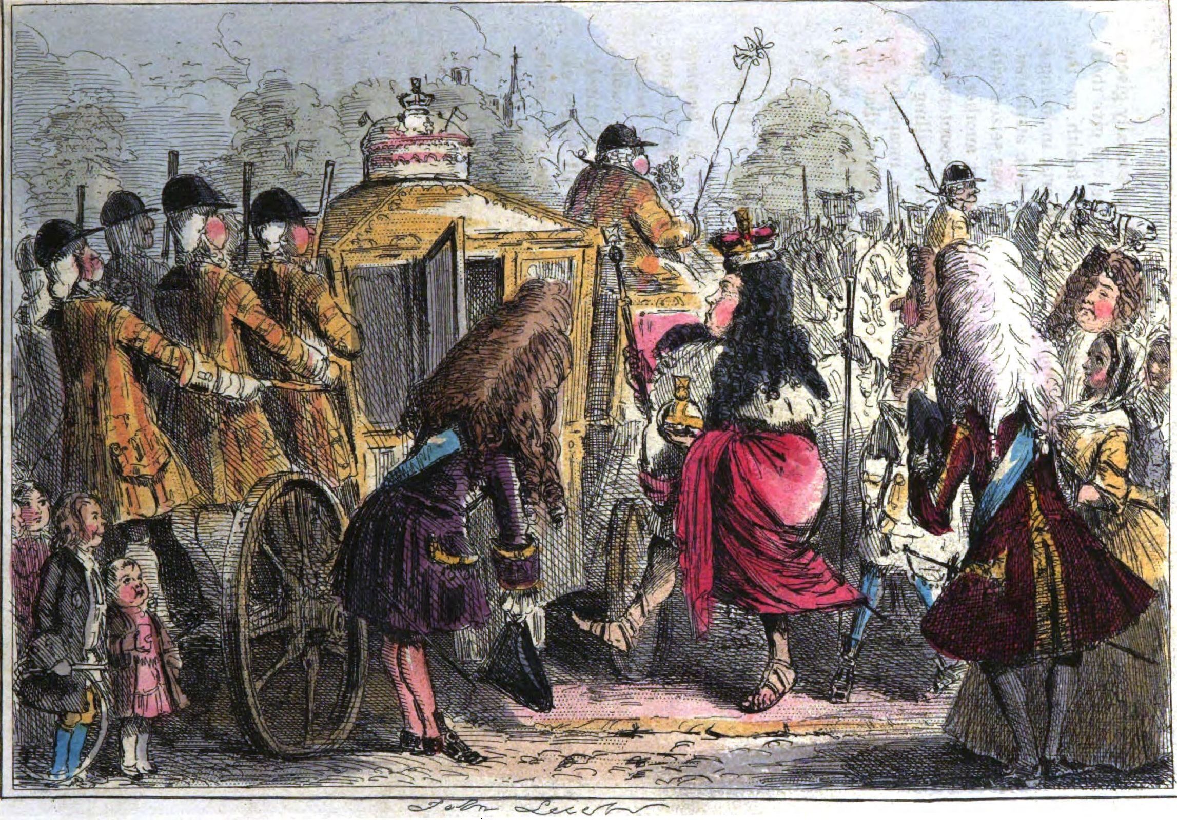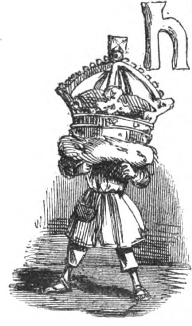 The king had only just arrived, and had merely gone into his bedroom to put on a clean collar—that of the Order of the Garter, if we may hazard a shrewd guess—when a party of Whigs rushed in, and began to ear-whig him with the utmost industry. In fact, the touting that took place for the vacant offices can only be imagined by an individual who has once landed at Boulogne, and found him-self torn to pieces by the hirsute representatives of some fifty hotels, each anxious to accommodate the new arrival. The whole of the Whig party pounced upon George, and thrust their pretensions before him with the perseverance of the class of Frenchmen, commonly called commissioners, to whom we have alluded. As these persons snatch at a traveller's cloak, walking-stick, or carpet-bag, the Whig touters almost snatched at gold sticks, official portfolios, or anything else they could lay their hands upon. "Allow me to take charge of your conscience, sir," roared Lord Cowper; "you'll find it very heavy to carry, sir; pray give it to me, sir; I'll take it down for you, sir;" and thus the Chancellorship was in a measure seized by this determined place-hunter. "You'll lose that privy seal, sir, if you don't take care," bellowed the Earl of Wharton; "you had much better entrust it to me; there are some very bad characters about just now,"—and thus, by a mixture of warning and worry, the privy seal was secured for himself by the rapacious nobleman.