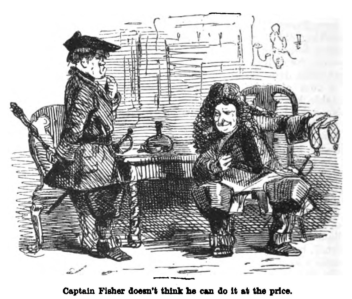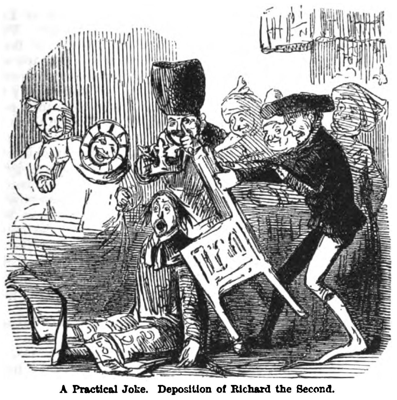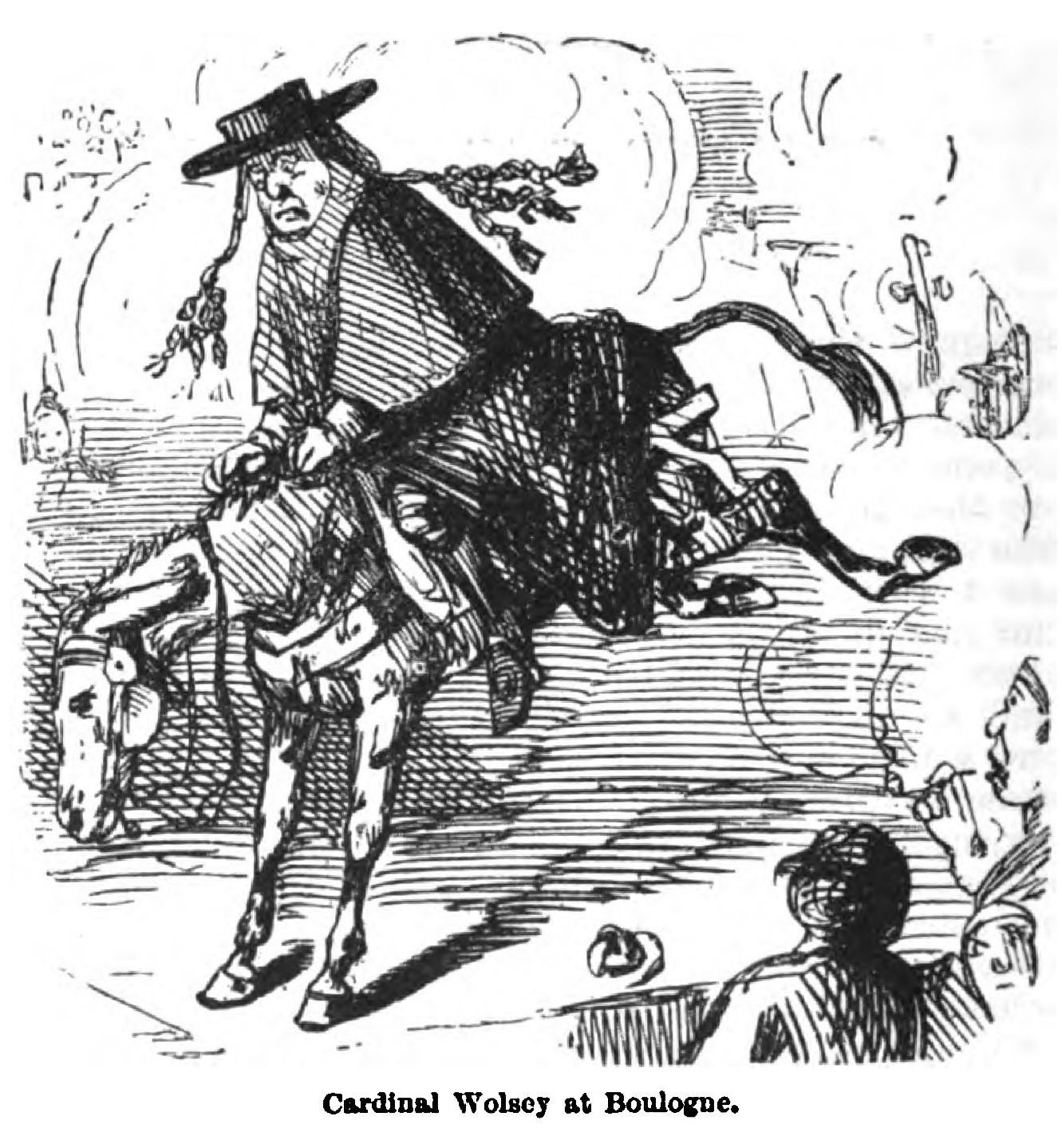 The king had only just arrived, and had merely gone into his bedroom to put on a clean collar—that of the Order of the Garter, if we may hazard a shrewd guess—when a party of Whigs rushed in, and began to ear-whig him with the utmost industry. In fact, the touting that took place for the vacant offices can only be imagined by an individual who has once landed at Boulogne, and found him-self torn to pieces by the hirsute representatives of some fifty hotels, each anxious to accommodate the new arrival. The whole of the Whig party pounced upon George, and thrust their pretensions before him with the perseverance of the class of Frenchmen, commonly called commissioners, to whom we have alluded. As these persons snatch at a traveller's cloak, walking-stick, or carpet-bag, the Whig touters almost snatched at gold sticks, official portfolios, or anything else they could lay their hands upon. "Allow me to take charge of your conscience, sir," roared Lord Cowper; "you'll find it very heavy to carry, sir; pray give it to me, sir; I'll take it down for you, sir;" and thus the Chancellorship was in a measure seized by this determined place-hunter. "You'll lose that privy seal, sir, if you don't take care," bellowed the Earl of Wharton; "you had much better entrust it to me; there are some very bad characters about just now,"—and thus, by a mixture of warning and worry, the privy seal was secured for himself by the rapacious nobleman.