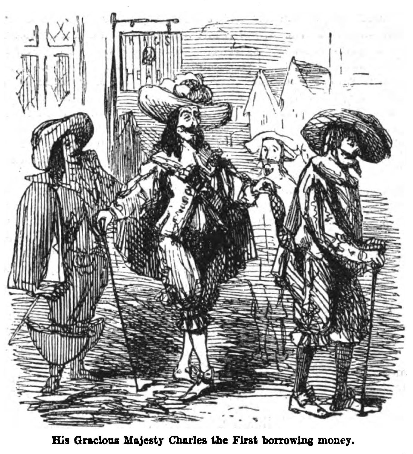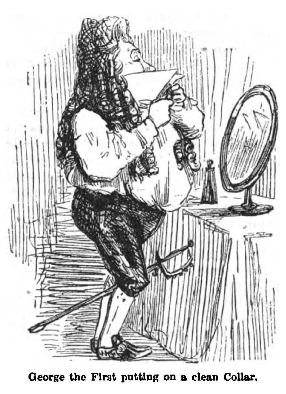 George the First had nothing in his character to justify us in keeping George the Second waiting to be shown up to the throne, where in the ensuing chapter we shall have the pleasure of seeing him. The first George was a person of somewhat feeble intellects, exceedingly shy in public, but he could "come out" at a private tea-party at home very effectively. His tastes were none of the most refined, and he voted all letters exceedingly dry but O.D.V.—such was the wretched pun the king made on eau de vie—which he was very partial to. It might be regarded as a redeeming point in the character of his majesty that he was very fond of Punch, which he regularly "took in," but this feather in his cap must be plucked out, for we find the Punch he patronised was the liquor, and not the periodical. Avarice was another of the most prominent features of his character, and he actually risked the throne itself on several occasions, because he would not spare a few pounds for the purchase of that floating loyalty that, in consequence of the venality and poverty of the ancient aristocracy, was always to be had at a certain price in the market. He had also the shabby trick of never carrying any money in his own pocket, so that he was always obliged to dip into the pockets of his companions to pay the expenses incurred, either at home or abroad, and many of his Court used to get as far away as possible from the side of the king when there was anything to pay, for he was sure to ask them for a loan on such occasions.