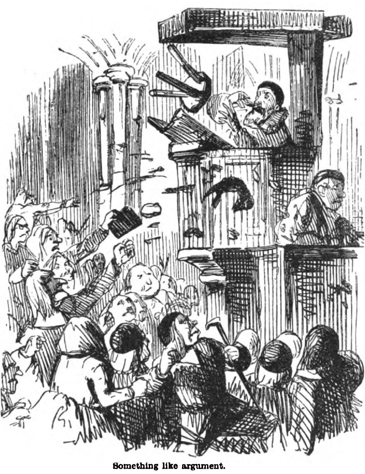 On the 5th of November in the same year a political parson, named Dr. Sacheverel, began to raise the since famous cry of "Church in danger," which, like that of "Wolf," has been since so frequently and foolishly set up, that it stands a chance of being neglected when it really may require attention. The object of all the rant in which this noisy churchman indulged, was to obtain popularity, flavoured with a spice of martyrdom, and his opponents being silly enough to fall into the trap, they kept up the ball for him with a vivacity that must have equalled his most sanguine desire. Like a shuttlecock, that must drop to the ground if its elevation is not secured by frequent blows, Sacheverel would have tumbled irredeemably to the earth, if he had not been kept aloft by the knocks he experienced. He was ultimately exalted into the position of a delinquent standing to take his trial at the bar of the House of Lords; and when he was found guilty of having preached a sermon, warning the public of danger to the Church, he had reached the highest point of glory in the estimation of the large mass of people who are under the influence of bigotry and prejudice. He was condemned to forbear from preaching for three years; but his sentence not excluding him from accepting a good living, one was placed at his disposal immediately afterwards. The reverend sufferer for conscience' sake eventually got something still better, in the form of the living of St. Andrew's, Holbom, where, finding it no longer worth his while to quarrel with the Government, he sought a vent for his turbulent disposition in repeated rows with his parishioners. His first sermon after his new appointment sold forty thousand copies, and a little calculation will give some idea of what the reverend gentleman's martyrdom brought him in from first to last in the shape of livings, copyrights, and other contingencies that arise out of a well-managed popularity.