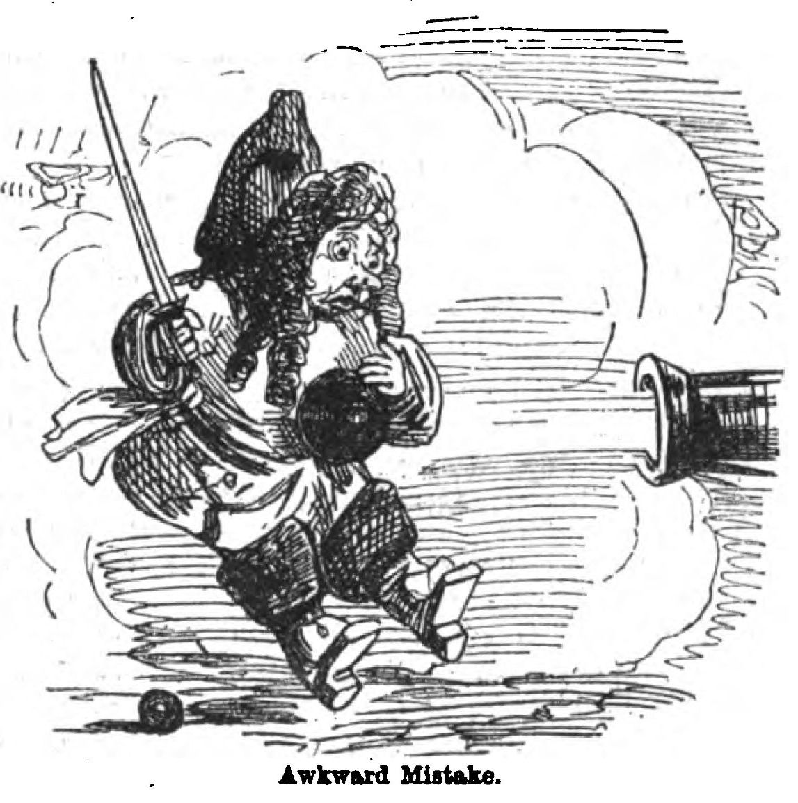 The rebels advanced in two columns; but the soldiers fell asleep, and we are not surprised at the fact, for any newspaper reader will admit that in the very idea of two columns there is something soporific in the extreme. The exhausted troops fell from fatigue; others lost their way; and the second column found it impossible to keep up with the first. This threw a damp upon the energies of even consternation on the boldest; and with a mental ejaculation of "Oh! it's no use," the very best of Charles Edward's adherents retired. Notwithstanding the valour of a corps consisting of picked men, there arose among them a feeling of dissatisfaction at standing unsupported, to be picked out by the artillery of the enemy; and though one gallant body withdrew, playing on their pipes, the pipes were very soon put out by a smart shower of bullets. Such was the upshot of one of the most spirited enterprises that ever was undertaken; and its chief, the unfortunate Charles Edward, became a pauper fugitive, with scarcely clothes to cover him, and there was quite as much necessity as nationality in the bareness of his legs, during the period of his wanderings.