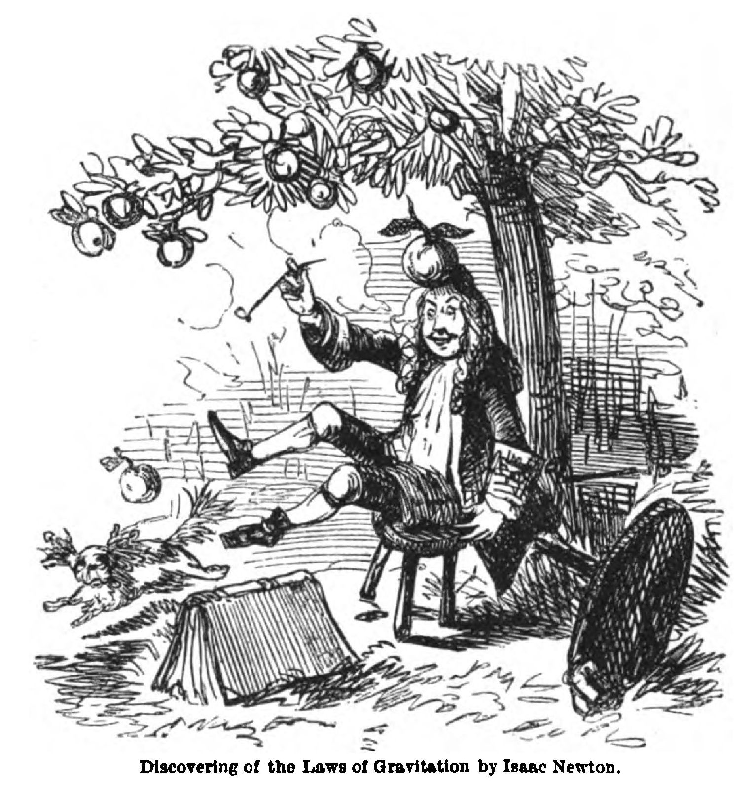 Isaac Newton was born in 1642, and came as unusually little into the world as he went greatly, and indeed gigantically, out of it. His mother declared he might have been put into a quart pot at his birth, and therefore, had he been always judged by the rule of "measures not men," he would never have attained the elevation he has arrived at. In early boyhood he displayed a great mechanical turn, and buying a box of carpenter's tools, he got perhaps the first insight into plane geometry, and deduced from a few wise saws, a variety of modern instances. He was very fond of measuring time, but not by its loss alone, for he constructed a wooden clock, and ascertained the position of the sun by driving nails into the wall—hitting, no doubt, the right one on the head very readily. Having a shrewd suspicion that there was something in the wind, he would occupy himself in leaping with it and against it, to ascertain its power. These pranks did not elevate him much in his class, of which he was generally at the bottom; for the routine of his school education did not include trials of strength with old Boreas, and the other exciting pursuits in which Master Isaac Newton indulged himself. In course of time he was removed to Cambridge, where the works of Des-Cartes fell into his hands, and where those ponderous volumes, from their soporific effect upon youth, often fall out of the hands they have fallen into. Young Newton grasped them with energy, and he soon profited amazingly by their contents, which set his own mind at work to add to the stock of discovery already in existence. During the great plague in 1665, he was compelled to leave Cambridge for a rural retirement, though the rustication was not of the ordinary kind: and while sitting in an orchard, "his custom sometimes of an afternoon," an apple fell upon his head with considerable violence.