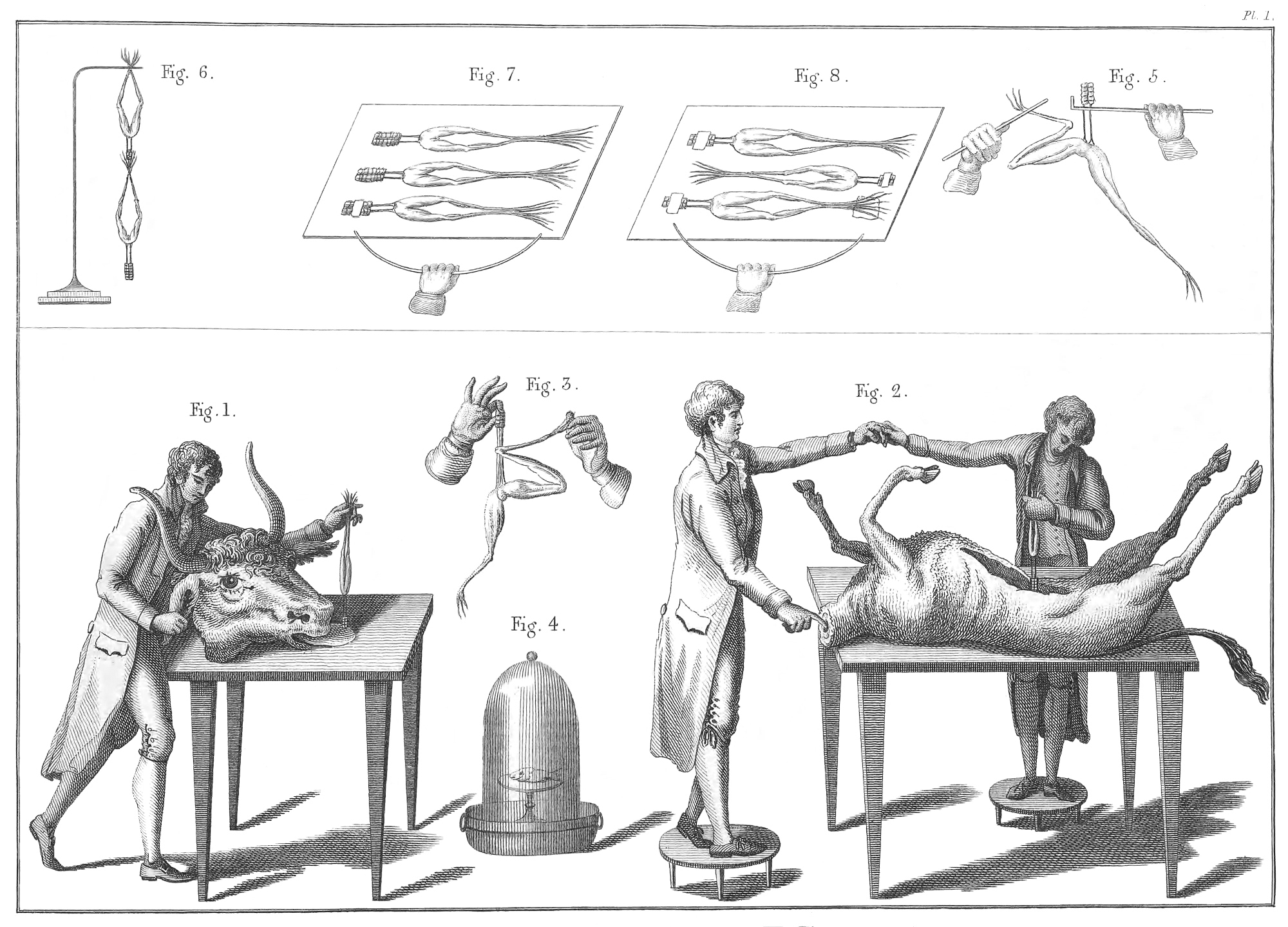 Having placed the trunk of a calf (Plate I. fig. 2.) on an insulated table, I made a longitudinal incision in the breast, in order to obtain a long series of muscles uncovered. I then arranged two insulated persons in such a manner that the one with a finger, moistened by salt water, touched the spinal marrow of the calf, while the other applied the spinal marrow of a frog to the muscles of the trunk. Every time this arc was formed, muscular contractions were produced in the frog. When the two persons let go each other’s hands, the contractions ceased. I repeated this experiment, with the same success, on the insulated head of an ox, conveying the arc from the spinal marrow of the frog to the tongue. Frogs were as violently affected when the experiment was made with the insulated trunks of different kinds of birds.