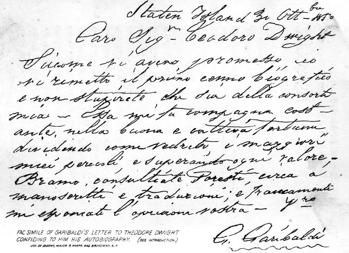 While General Garibaldi resided in New York and its vicinity, in the years 1850 and '51, the author of this book enjoyed his acquaintance, and the favor of receiving from him his private memoirs, with permission to translate and publish them.[1] They had just been prepared for the press, when Garibaldi requested that they might be withholden from the public while he remained in this country, probably because he preferred to be unnoticed, being at that time employed in making candles on Staten Island, and naturally fond of retirement.
