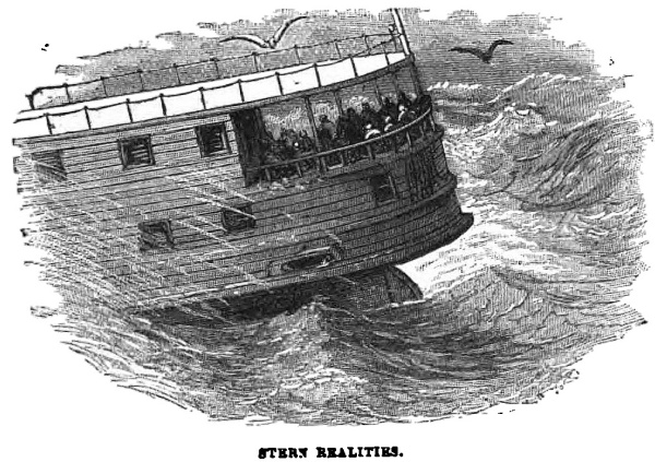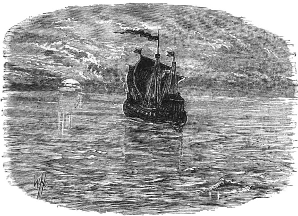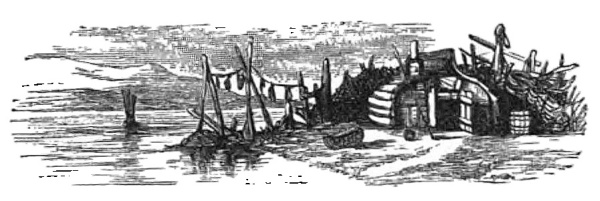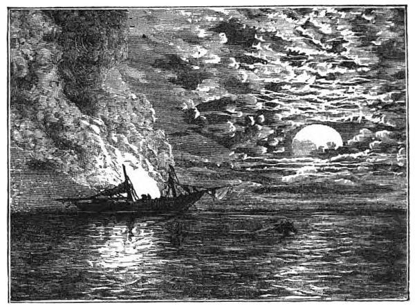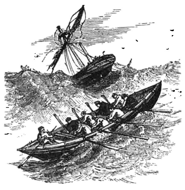 “Every one was about retiring for rest, when boom boom! from out of the darkness seaward came the roar of a minute gun. Some great ship was on the rocks not far off. Boom! and no assistance could be given. There was no rocket, no lifeboat, and no ordinary boat could live in that sea. Boom! Everybody was down on the beach, and ere long the great red moon rose and showed, as had been expected, the dark hull of a ship fast on the rocks, with her masts gone by the board, and the sea making a clean breach over her. The villagers were brave; they attempted to launch a boat. It was staved, and dashed back on the beach.