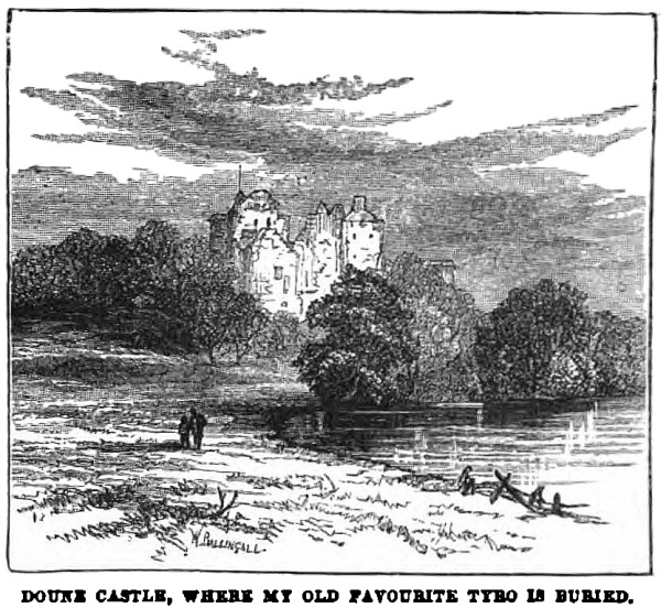 Then onward we went to beautiful and romantic Perth. Then on to Callander and Doune. At the latter place we visited the romantic ruin called Doune Castle, where my old favourite Tyro is buried. In Perthshire we spent several days, and once had the good or bad fortune to get storm-stayed at a little wayside hotel or hostelry, where we had stopped to dine. The place seemed a long way from anywhere. I’m not sure that it wasn’t at the back of the north wind; at all events, there was neither cab nor conveyance to be had for love nor money, and a Scotch mist prevailed—that is, the rain came down in streams as solid and thick as wooden penholders. So we determined to make the best of matters and stay all night; the little place was as clean as clean could be, and the landlady, in mutch of spotless white, was delighted at the prospect of having us.