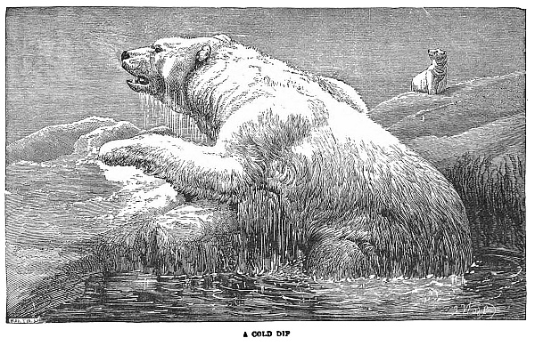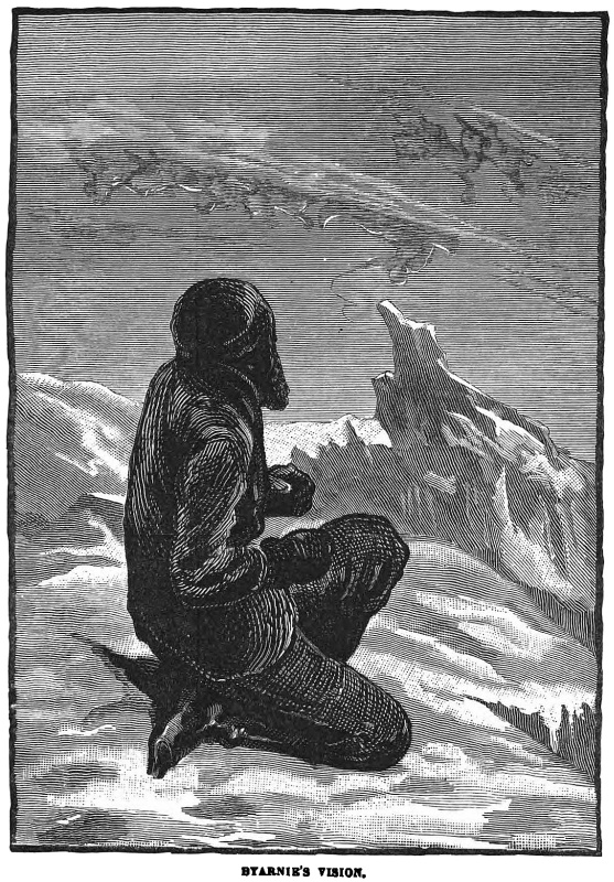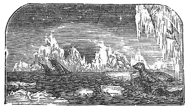 “Here it is again, mother, a vast and lonely trackless waste of snow; great glaciers, against whose sides mountain waves for ever dash and foam; icebergs whose pinnacled heads taper upwards into a sky of cloudless blue. Fields of ice on which white bears roam; dark, inky seas where the walrus plays and tumbles, and through which the solitude-loving narwhal pursues his finny prey; and crystalline caves where sea-bears roar. But the scene is changed: it is night—the long, long, Polar night. Oh, how bright and beautiful the Aurora, with its ever-changing tints of crimson, green, and blue; and the stars, how near they seem; and the silence, how deep, how awful! But see, a storm is coming across the pack, and clouds are banking up and hiding the glorious Aurora; now it is on us, and higher than the stars rise the clouds of whirling, drifting snow. Hark! how the wind howls! There is danger on its wings; there is—”