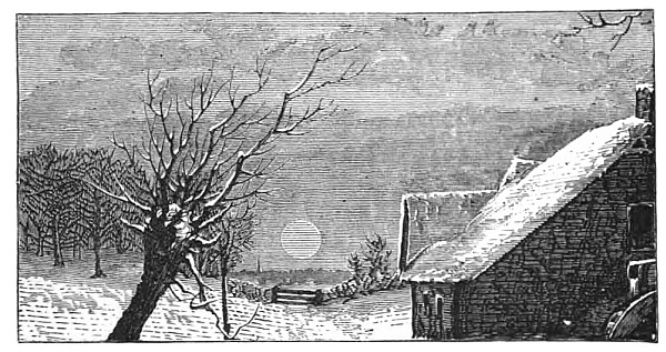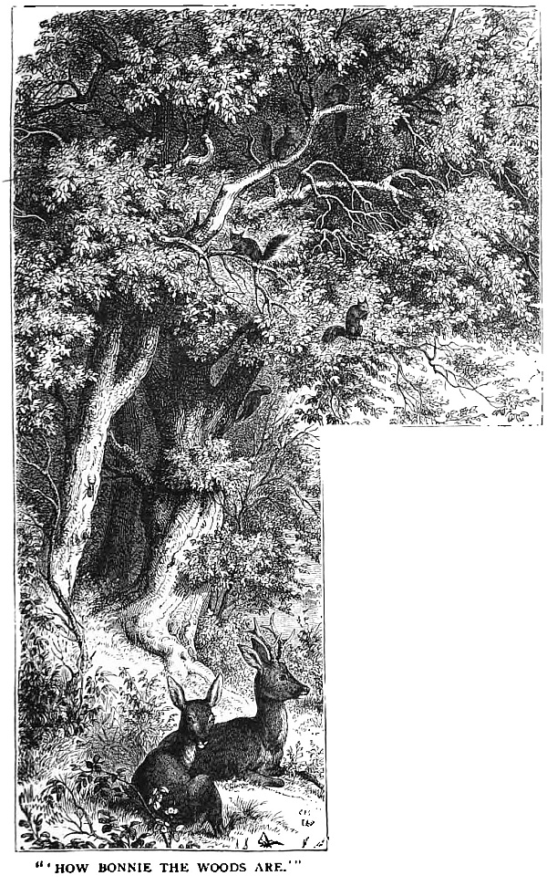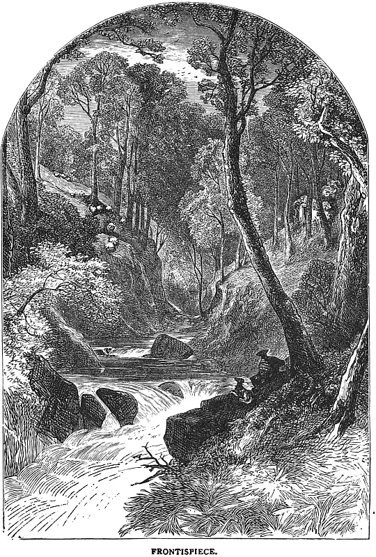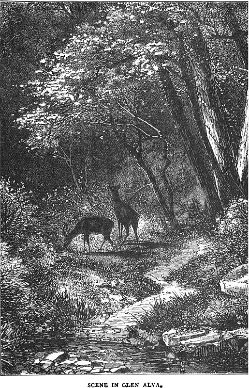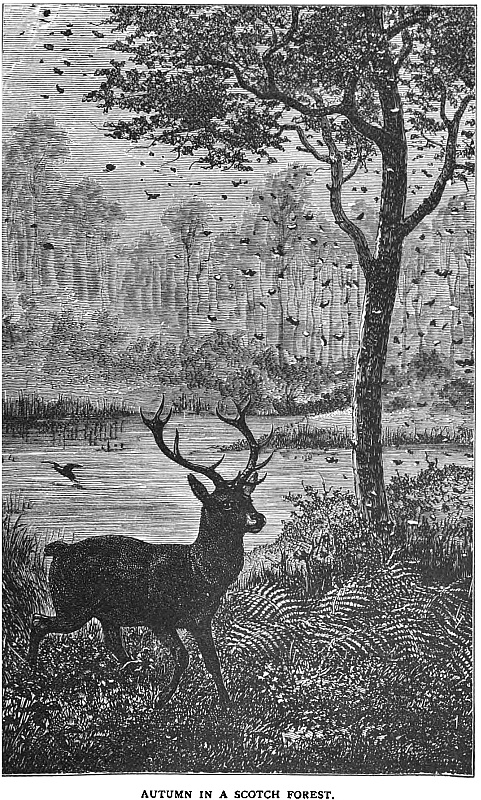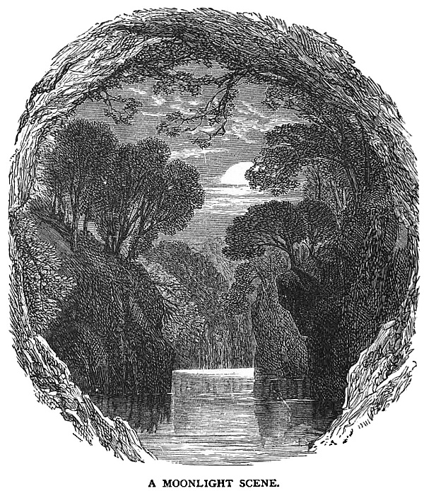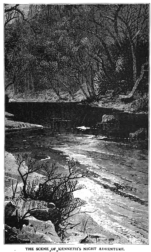 Kenneth had two long Scotch miles to walk, down into a thicket of fir trees first, across a rustic bridge, under which the brown stream was dashing and swirling and ever and anon breaking itself into foam against the boulders. It was very dark down here, but Kenneth was soon away out into the open country again, and the roar of the river was no more heard. By-and-bye the road led through a wood of oak, ash, and elm trees, with now and then the dark head of a pine tree shooting high up into the sky. The moonlight showed in patches here all along the road, there was the sound of falling water not far off, mingling with the whispering of the wind among the leaves, now crisp with the sunshine of the long bright summer, and there was occasionally the mournful cry of the brown owl, which made Kenneth feel lonesome and “eerie,” and he was not sorry when he was clear of that dark gloomy wood, and saw up on a hillside the light shining yellow through the blind of Keeper McCrane’s cottage.