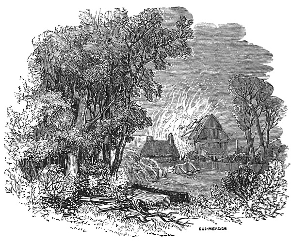 Scene: A long, low-thatched cottage, in the midst of a wild, bleak moorland. No other hut nor house in sight. Around the cottage is a garden or kail-yard, with a fence of flat, slab-like stones. In this is a gate half open, and hanging by one hinge. The cottage has its door in the gable, and is windowless, save for some holes ’twixt thatch and eaves, through which light is now glimmering. A bright round moon is riding in the sky, among a few white clouds, that look like wings. Coming towards the gateway, two figures may be seen, both in the Highland garb. Behind them two dogs.
