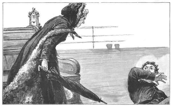 Aunt rises as I speak, and together we leave the turret chamber, and, passing through the great conservatory, we reach the promenade. We lean on the battlement, long since dismantled, and gaze beneath us. Close to the castle walls below is a well-kept lawn trending downwards with slight incline to meet the loch which laps over its borders. This loch, or lake, stretches for miles and miles on every side, bounded here and there by bare, black, beetling cliffs, and in other places