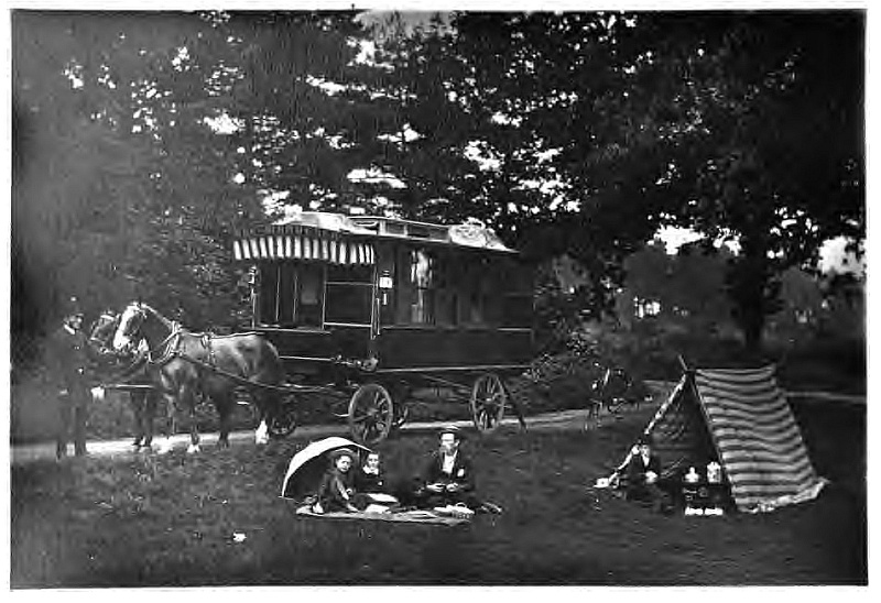 “The man who is master of a caravan,” says a writer, “enjoys that perfect freedom which is denied to the tourist, whose movements are governed by the time-table. He can go where he likes, stop when he lists, go to bed at the hour which suits him best, or get up or lie daydreaming, knowing there is not a train to catch nor a waiter’s convenience to consult. If the neighbourhood does not suit the van-dweller, all he has to do is to hitch in the horses and move to more eligible quarters. The door of his hotel is always open. There is no bill to pay nor anybody to ‘remember;’ and, if the accommodation has been limited, the lodger cannot complain of the charges. In a caravan one has all the privacy of a private residence, with the convenience of being able to wheel it about with a facility denied to the western settler, who shifts his ‘shanty’ from the ‘lot’ which he has leased to the more distant one which he has bought. In the van may, for all the passer-by can discover, be a library and drawing-room combined, or it may be bedroom and dining-room in one, though, as the pioneers in this mode of touring sleep under canvas, we may presume that they find the accommodation indoors a little stuffy.”